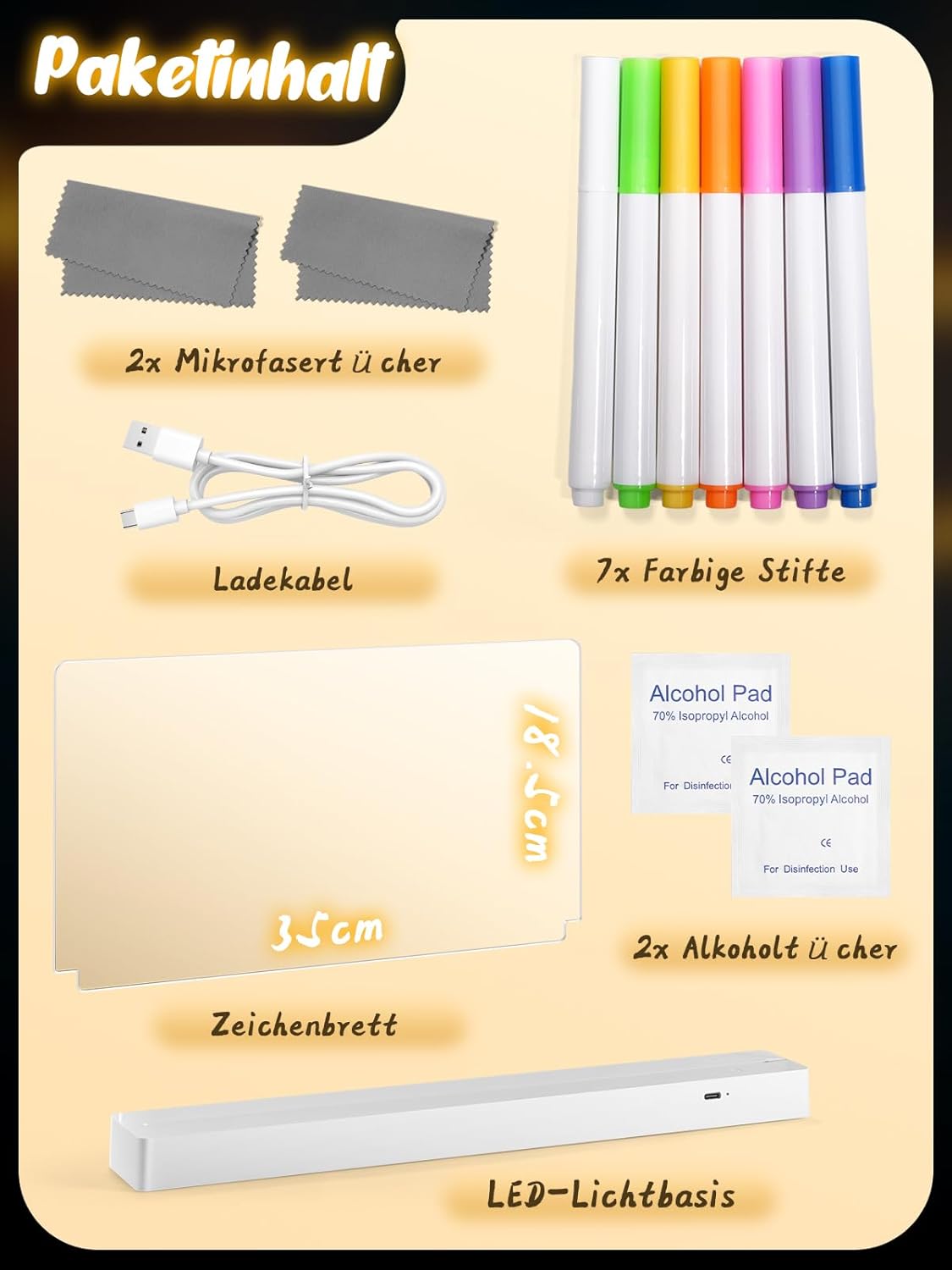 - Komplettes Zubehör-Set: Im Set enthalten: 1 LED Zeichentafel Kinder mit 2 Lichteffekten, 7 Marker, 1 USB-C Kabel, 2 Reinigungstücher, 2 Feuchttücher und 1 Anleitung. Sofort startklar für kreativen Malspass!