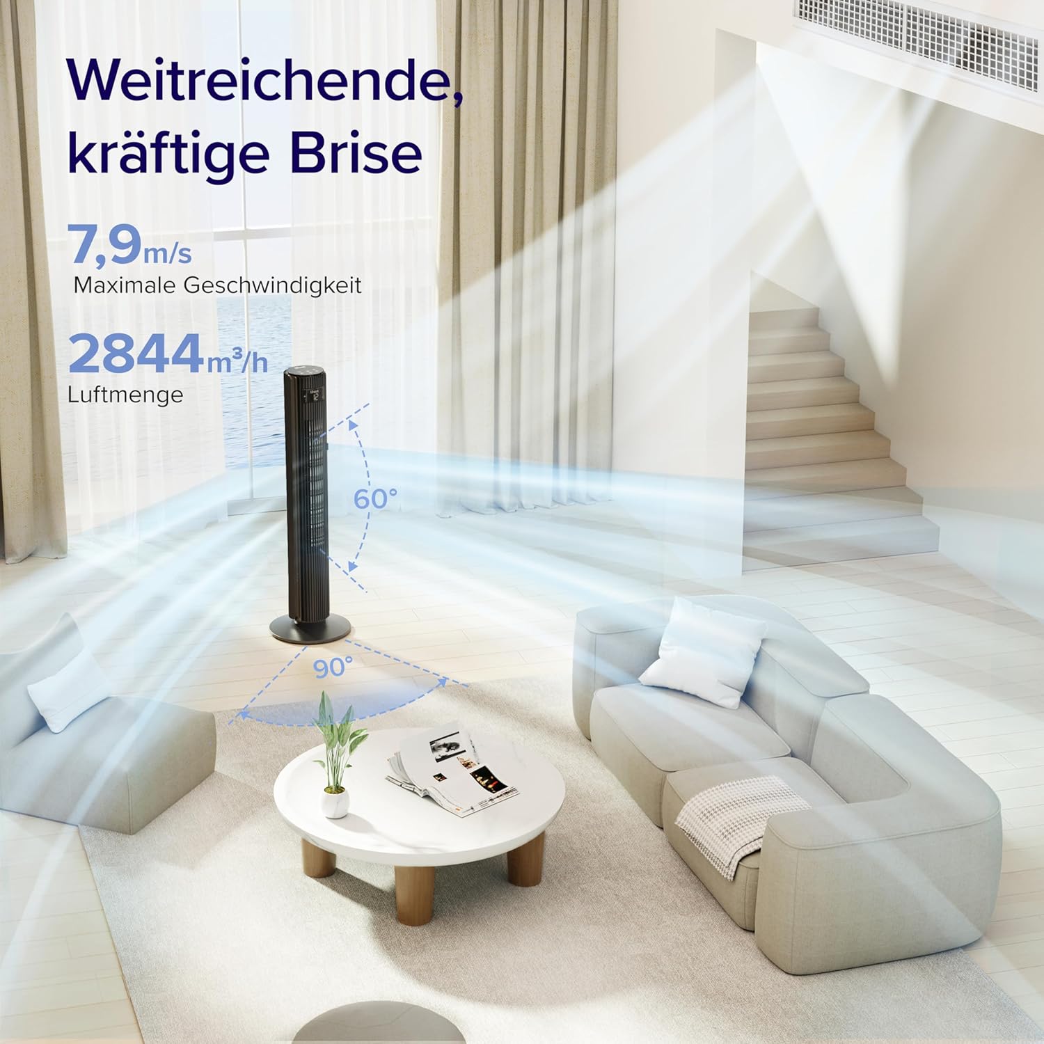 - Starker Wind: Die Windgeschwindigkeit dieses Tower Fan erreicht 7,9m/s, wodurch die Kühlung des gesamten Hauses schnell erreicht wird