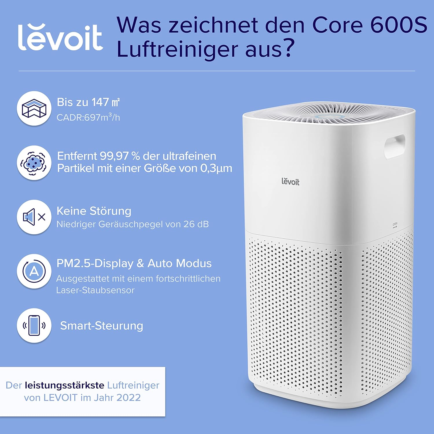 - 【Hohe Leistung für grosse Räume】Mit CADR von 697m³/h und der 360-Grad-Lufteinlasskonstruktion reinigt Core 600S ein grosse Räume bis zu 147㎡ zweimal pro Stunde. Dank seines energieeffizienten Designs erreicht der Luftreiniger eine maximale