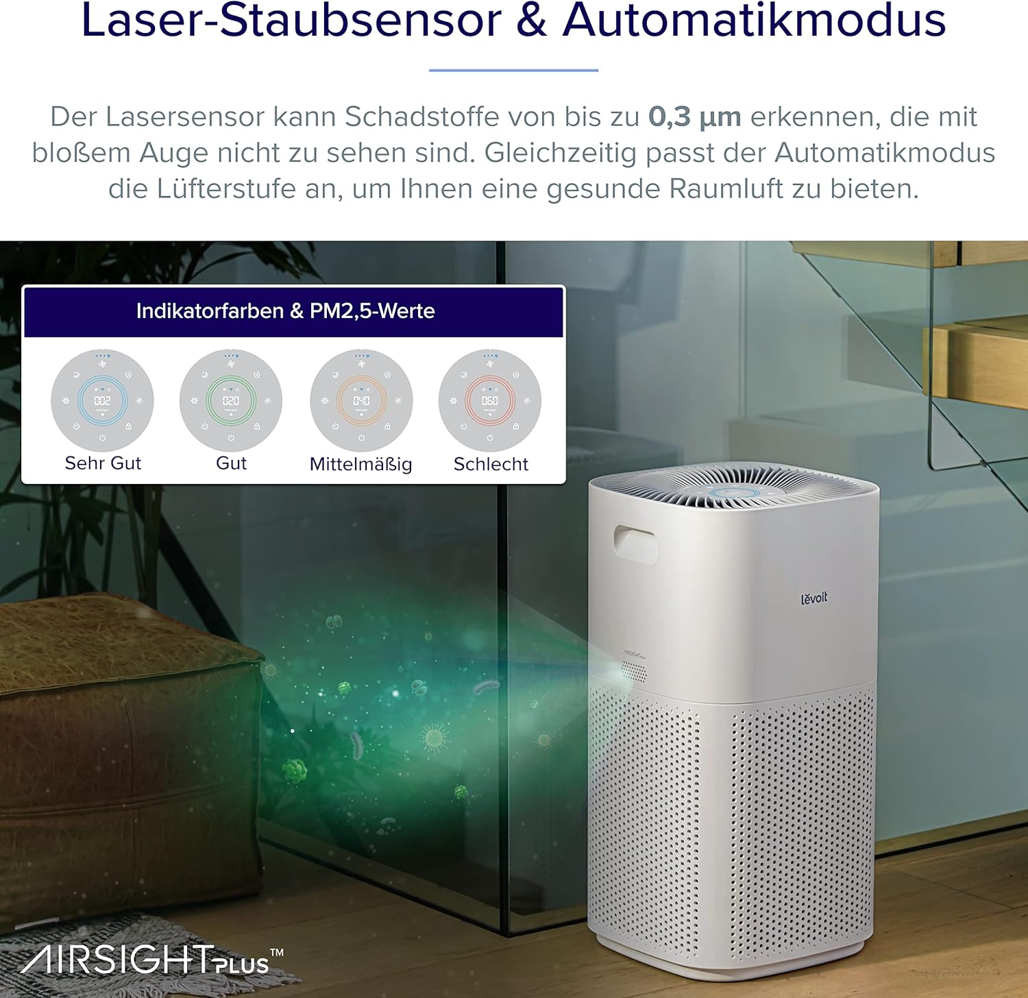 - 【PM2,5 Luftqualitätsanzeige】Mit fortschrittlichem Lasersensor überwacht Core 600S Ihre Raumluft in Echtzeit und zeigt PM2,5 in Zahlen auf dem Display sowie ein intuitiver Farbring an, dann wählt die richtige Lüfterstufe für Ihr Zuhause aus (im