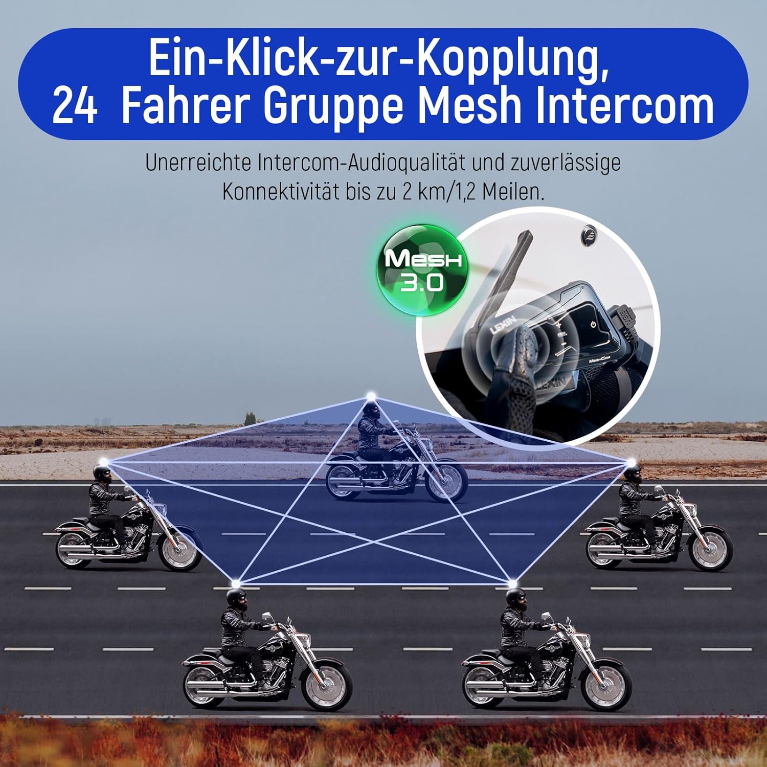 • Mesh 3.0 Intercom und Bluetooth Intercom: LEXIN MeshCom Intercom unterstützt bis zu 24 Personen gleichzeitig zu sprechen, und der weiteste Reichweite beträgt zwei Kilometer. Bluetooth 5.0 Intercom unterstützt ein 2-Wege-Gespräch mit anderen