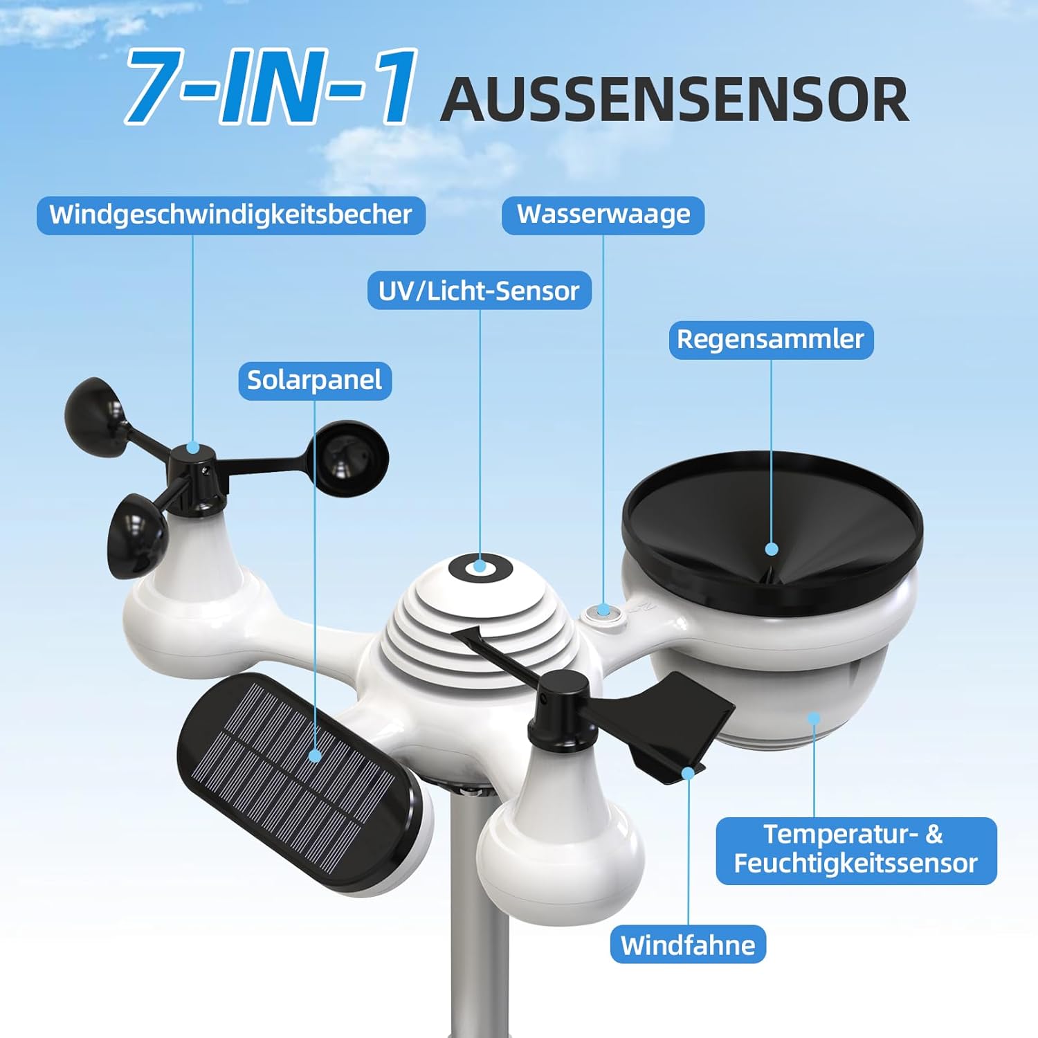 - 👍 7-in-1-Aussensensor: Der Aussensensor wird an einem Mast installiert, um die Wetterdaten für den Aussenbereich in Echtzeit anzuzeigen. Der Sensor besteht aus einer Windfahne, einem Windmesser, einem Temperatur-/Luftfeuchtigkeitssensor, einem