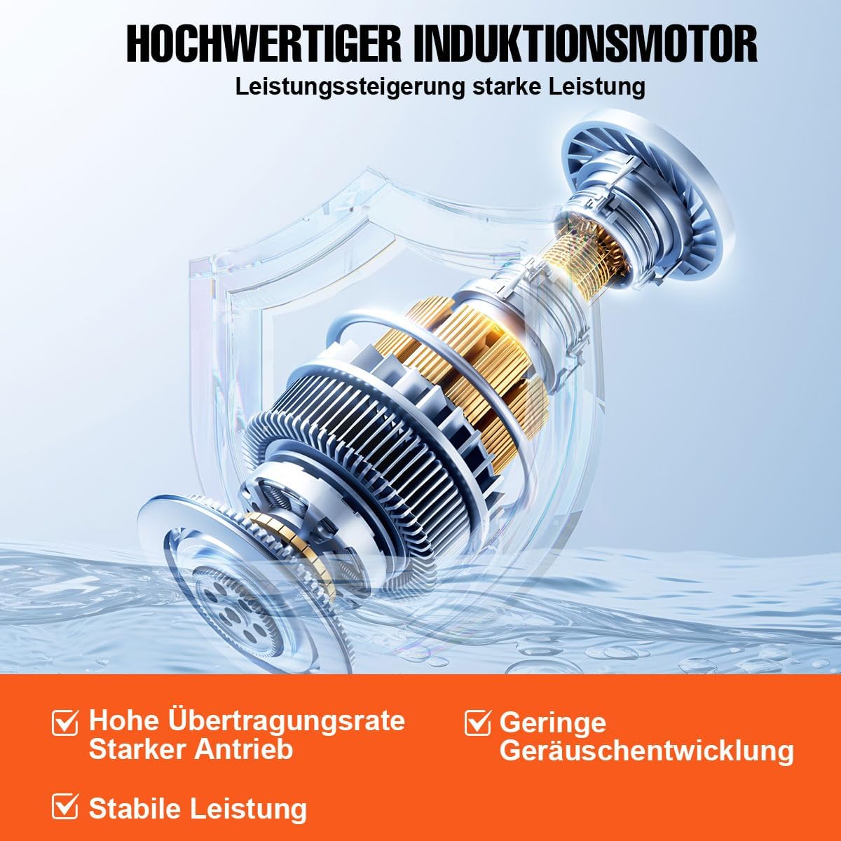 • Der Kabel- und Pumpenanschlussteil wird durch eine Kette verstärkt, dies schützt das grosse Teil und verhindert, dass Wasser in den Motorraum gelangt.Kontinuierliches Laufen im Wasser von rechts. Kunststoffpumpenkörper und offenes LaufradGrosse