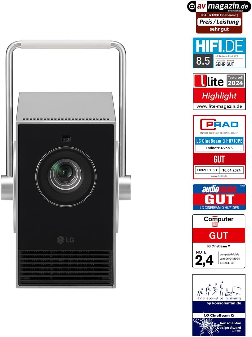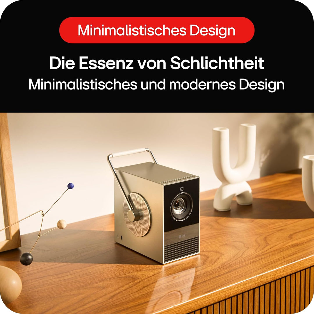 - Smart-TV-Funktionalitäten über das eigens entwickelte webOS 6.0 Betriebssystem – inklusive App Store, Webbrowser und Screen Sharing / Leichter Transport durch den integrierten Tragegriff, der es zusätzlich ermöglicht, den Projektor angewinkelt