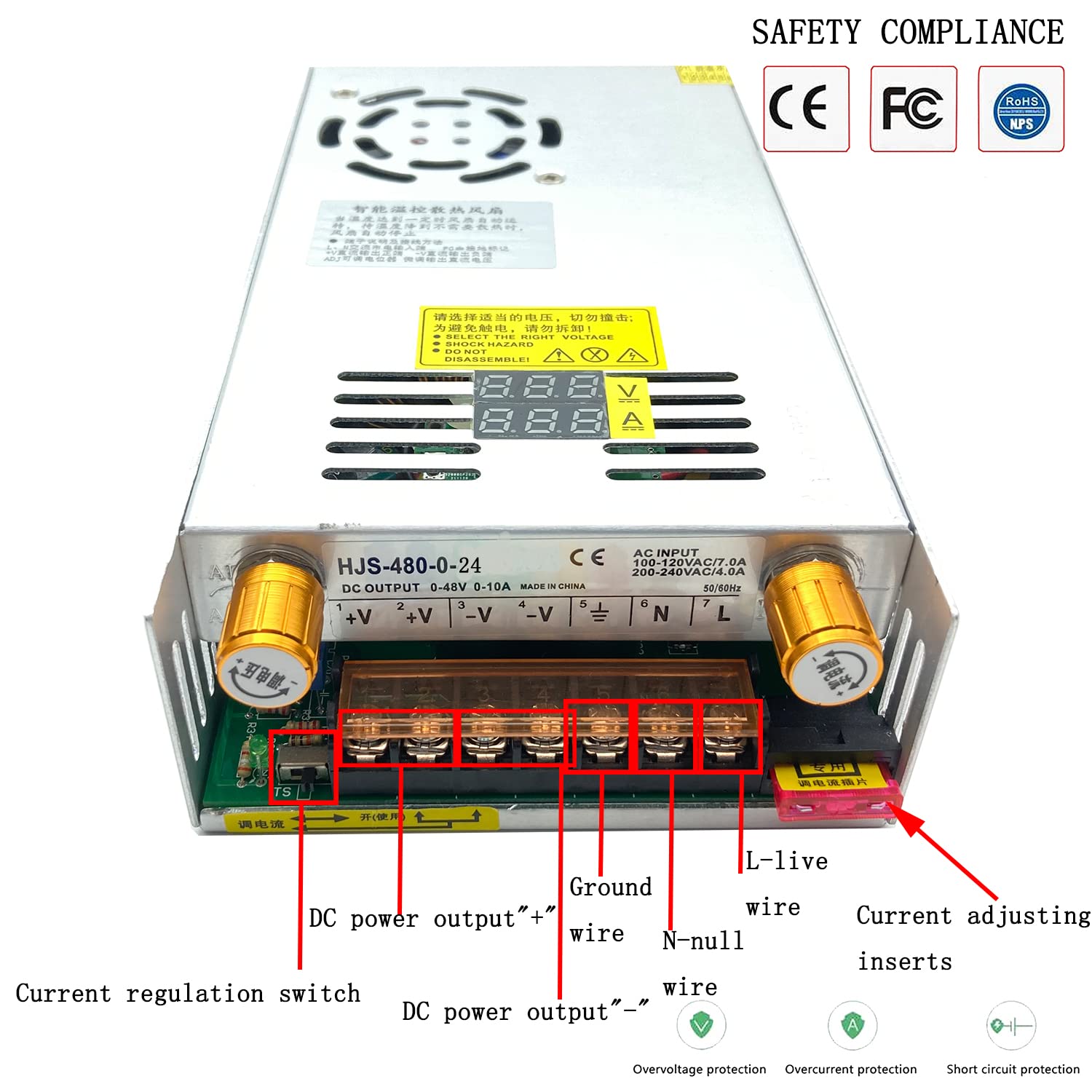 - Universelle Eingangsspannung: AC 110-220V; Ausgangsspannung: DC 0-24V 0-20A; maximale Ausgangsnennleistung: 480W. Die Ausgangsspannung und der Strom werden innerhalb des gesamten Leistungsbereichs durch interne Strom- und Spannungspotentiometer