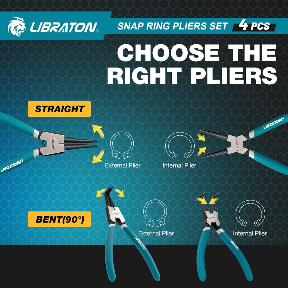 - 4-teiliges Sprengringzangen-Set für Innen- und Aussensicherungen: Das professionelle 180-mm-Sprengringzangen-Set beinhaltet: 1 gerade Aussenzange (max. 40 mm Öffnung), 1 um 90° gebogene Aussenzange (max. 32 mm), 1 gerade Innenzange (max. 42 mm), 1 um