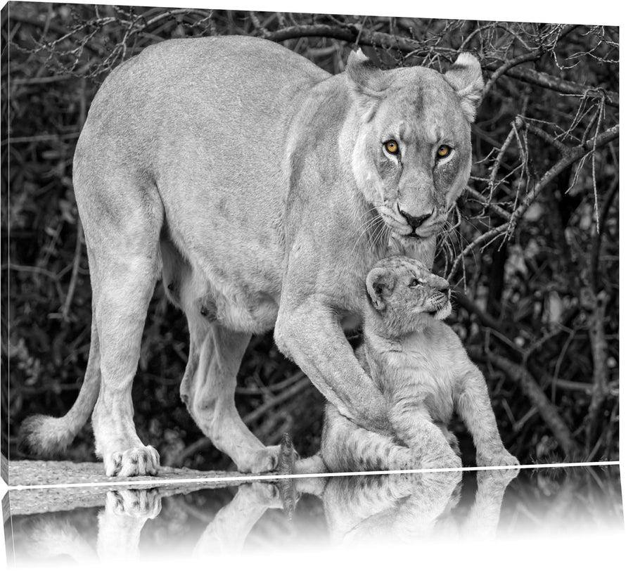 liebevolle Löwin spielt mit Jungtier schwarz/weiss auf Leinwand, XXL riesige Bilder fertig gerahmt m