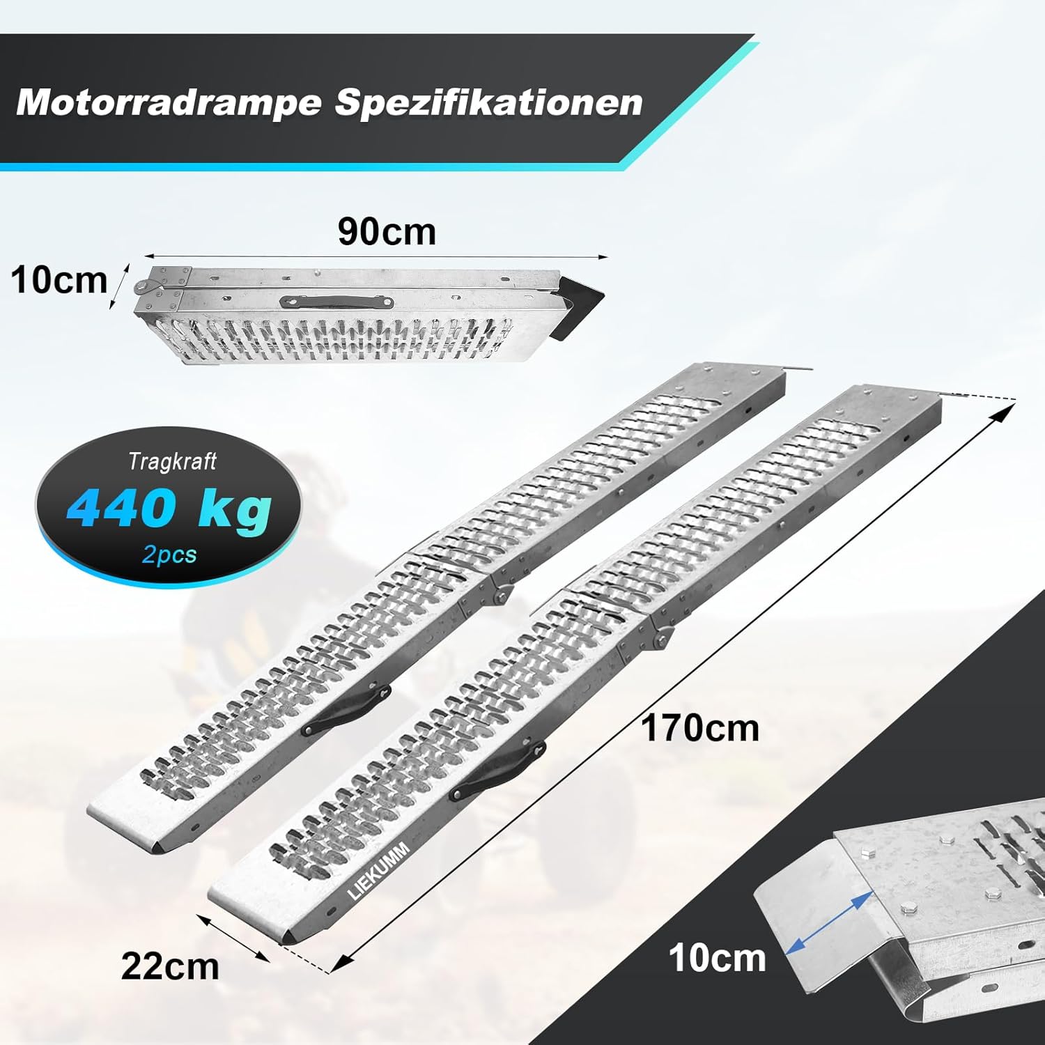 - 【Starke Tragfähigkeit】Hochbelastbare Laderampen aus Stahl wiegen 14,3 kg jedes Paar Rampe und jede Rampe kann bis zu 220 kg tragen. Die Tragfähigkeit der beiden Teile zusammen kann 440 kg erreichen. Diese Rampe ist aus Stahl gefertigt und ist eine