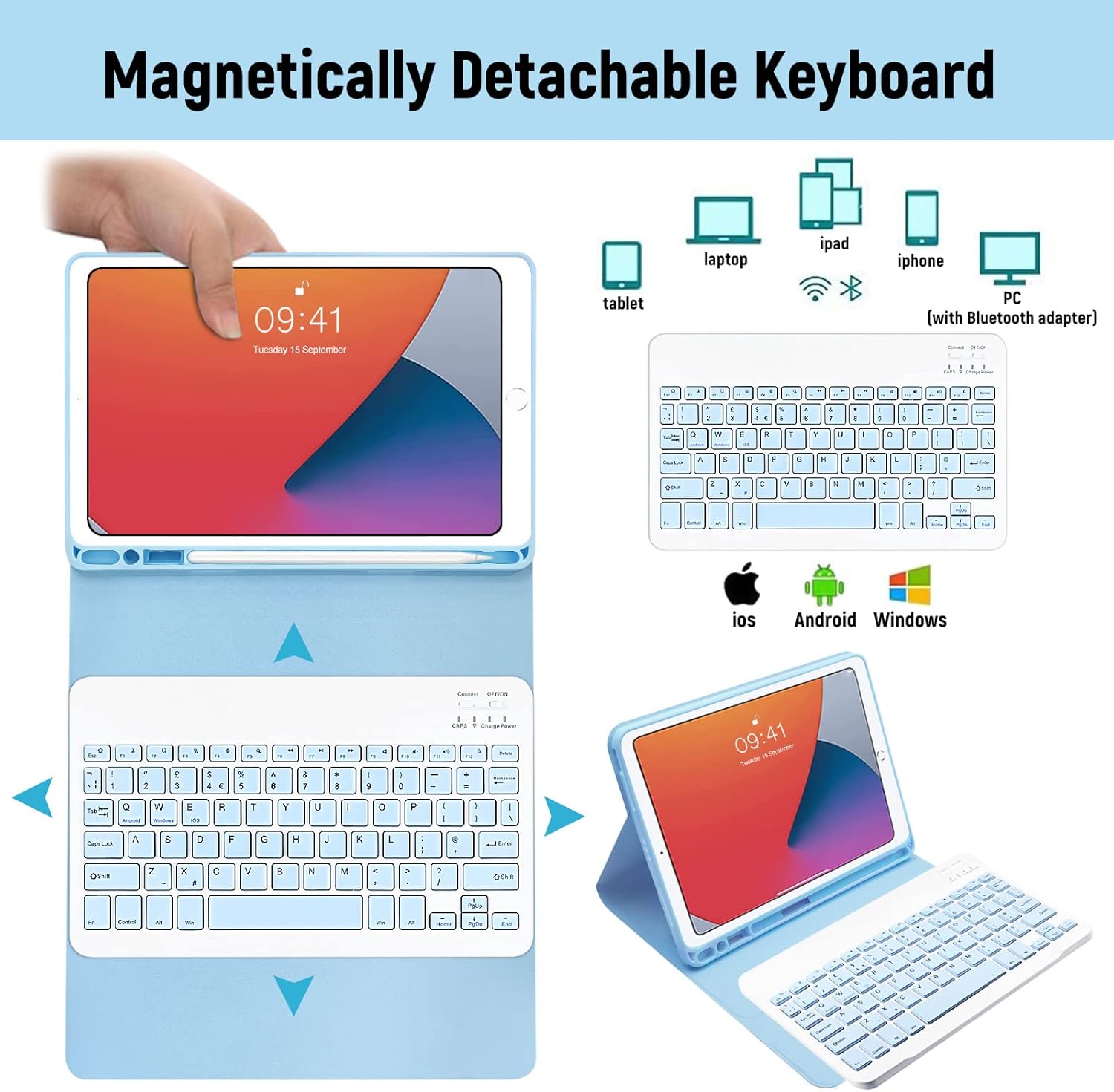 - Magnetisch abnehmbare kabellose Tastatur. Diese kabellose iPad 10,2 Zoll Tastatur ist magnetisch an einer robusten Hülle befestigt und kann leicht entfernt werden, wenn sie nicht benötigt wird. Abnehmbare Bluetooth-Tastatur mit magnetischer Hülle, die