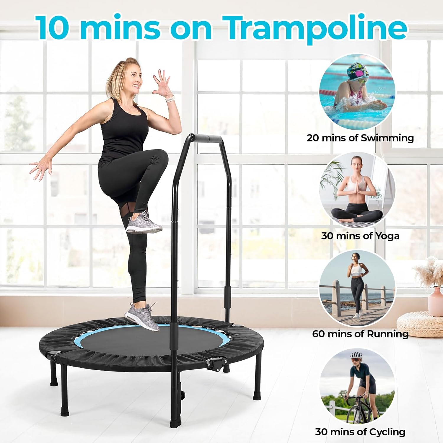 - 【Effiziente Fitness】 Mit diesem Trampolin können Sie verschiedene Muskelgruppen trainieren. Nur 10 Minuten auf dem Indoor-Trampolin zu springen, entspricht 20 Minuten Schwimmen, 30 Minuten Laufen, 30 Minuten Radfahren oder 30 Minuten Yoga und hilft