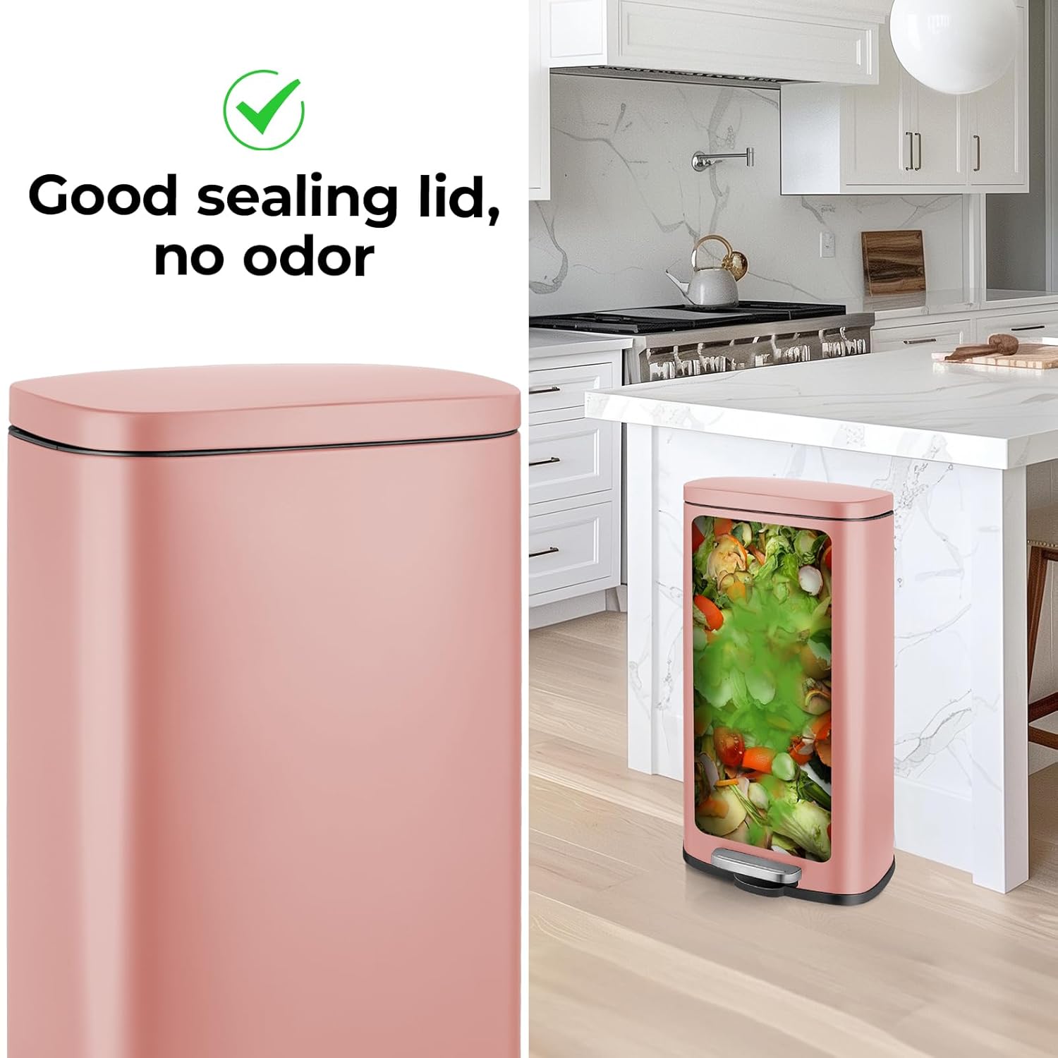 - 【Geruchsisolierung】 Der Deckel hat eine hohe Passform und eine gute Abdichtung, und der vollständig geschlossene, auslaufsichere Boden kann die Abgabe von Gerüchen wirksam verhindern. Es ist ein sehr geeigneter Mülleimer für den Innenbereich.