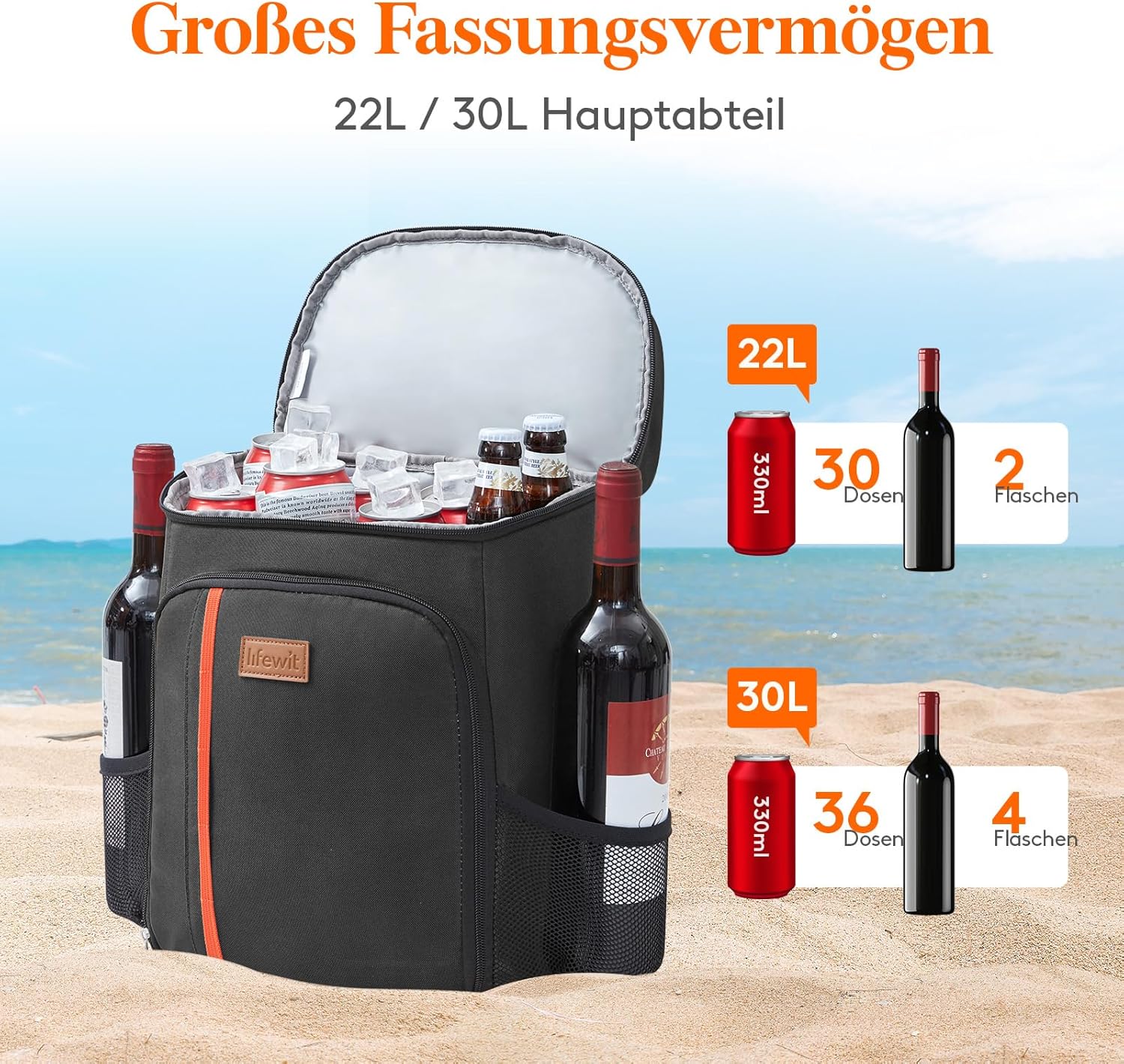 - Grosses Fassungsvermögen: Mit den Massen von 30,5 x 17,8 x 40,5 cm beträgt das max. Fassungsvermögen des Kühlrucksacks 22 L. Er ist geräumig genug für 30 Dosen Cola (330 ml) und bietet Platz für Mahlzeiten, Bier, Snacks, grosse Getränke,