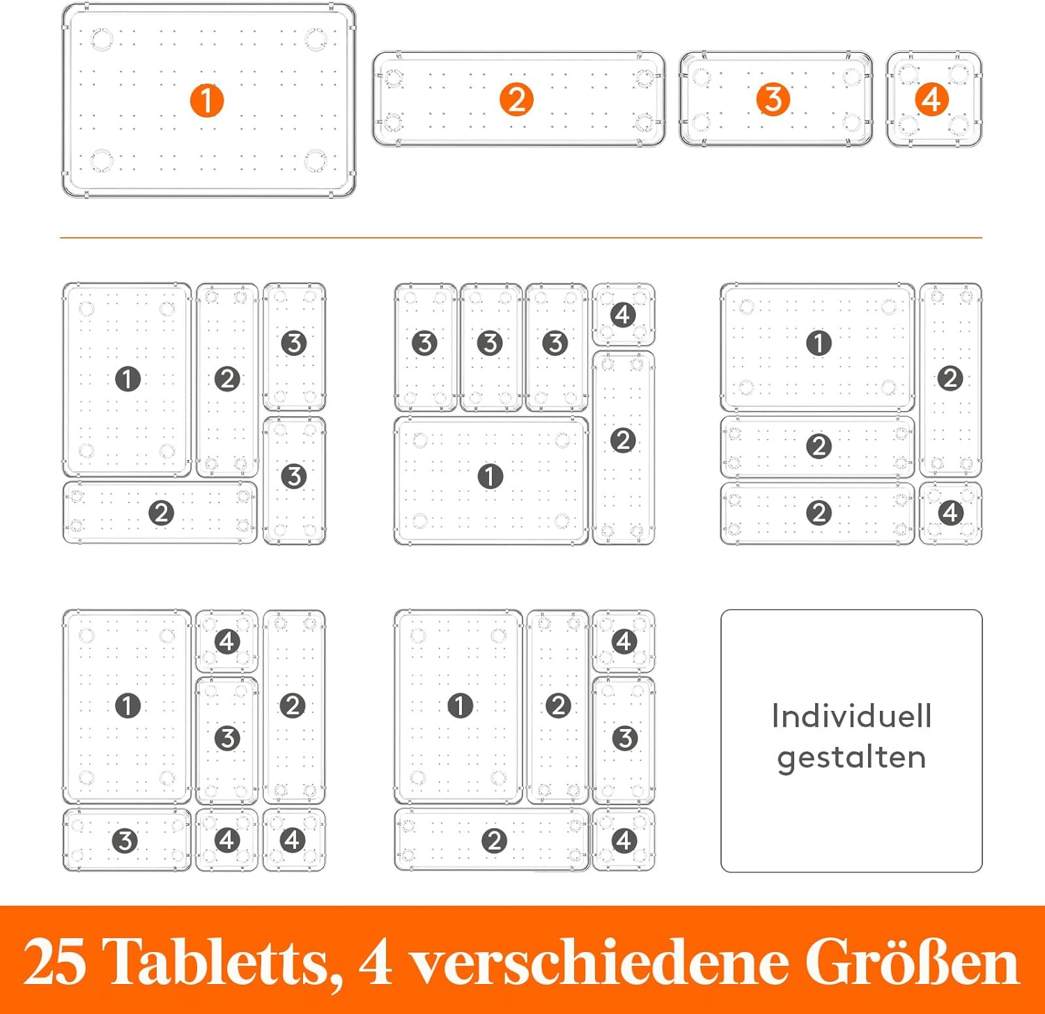 - Individuell anpassen: 25 Ablagen in 4 verschiedenen Grössen, die Sie nach Belieben anpassen und verwenden können. Sie können sie mühelos kombinieren und an alle Schubladengrössen und Platz anpassen.