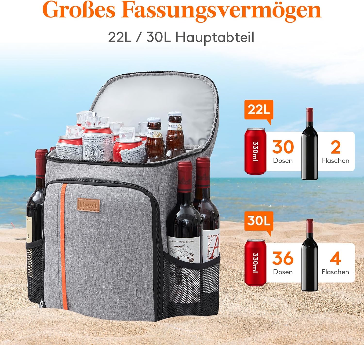 - Grosses Fassungsvermögen: Mit den Massen von 33 x 20,3 x 43 cm beträgt das max. Fassungsvermögen des Kühlrucksacks 30 L. Er ist geräumig genug für 36 Dosen Cola (330 ml) und bietet Platz für Mahlzeiten, Bier, Snacks, grosse Getränke, Handtücher,