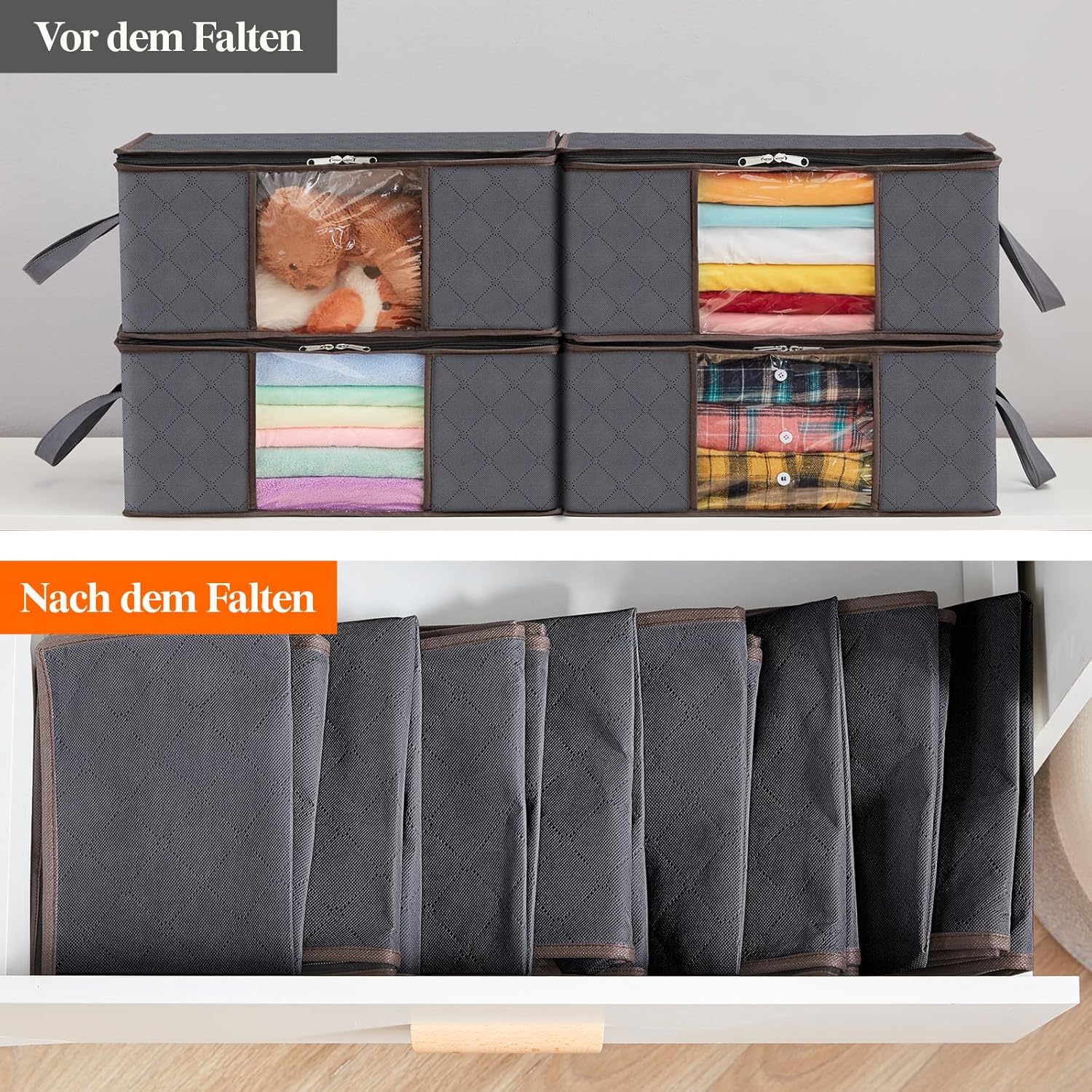 • Durchsichtiges Fenster : Jeder zusammenklappbare Aufbewahrungsbehälter verfügt über ein durchsichtiges Fenster, damit Sie schnell finden, was Sie suchen.