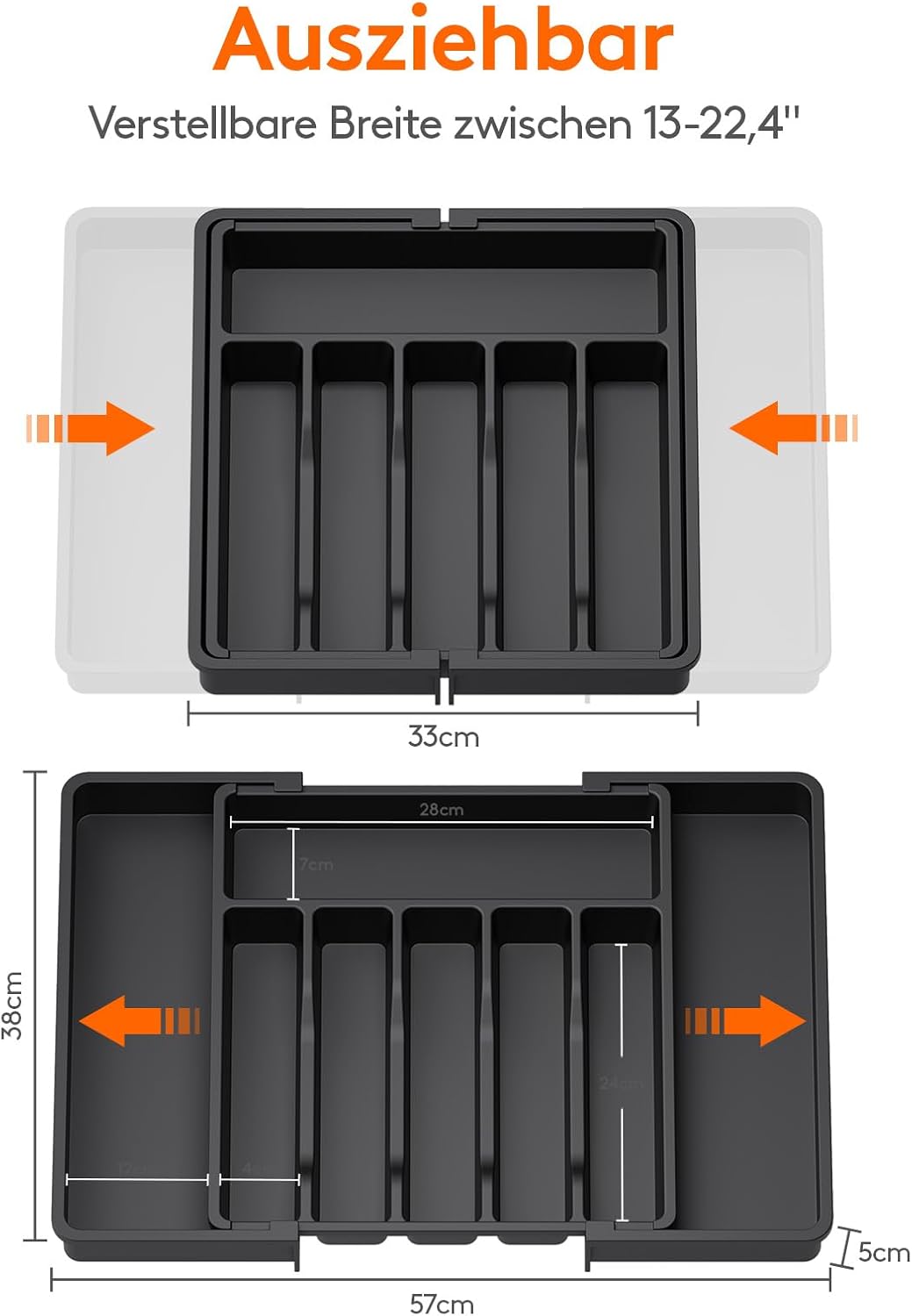- Verstellbare Grösse: Mit einer verstellbaren Breite von 33 bis 57 cm ist der Besteckeinsatz mit verschiedenen Schubladengrössen kompatibel. Im ausgezogenen Zustand hat der Besteckkasten eine Masse von 57 x 38 x 5 cm und im zusammengeklappten Zustand