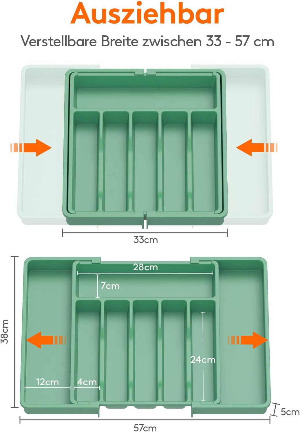 - Verstellbare Grösse: Mit einer verstellbaren Breite von 33 bis 57 cm ist der Besteckeinsatz mit verschiedenen Schubladengrössen kompatibel. Im ausgezogenen Zustand hat der Besteckkasten eine Masse von 57 x 38 x 5 cm und im zusammengeklappten Zustand