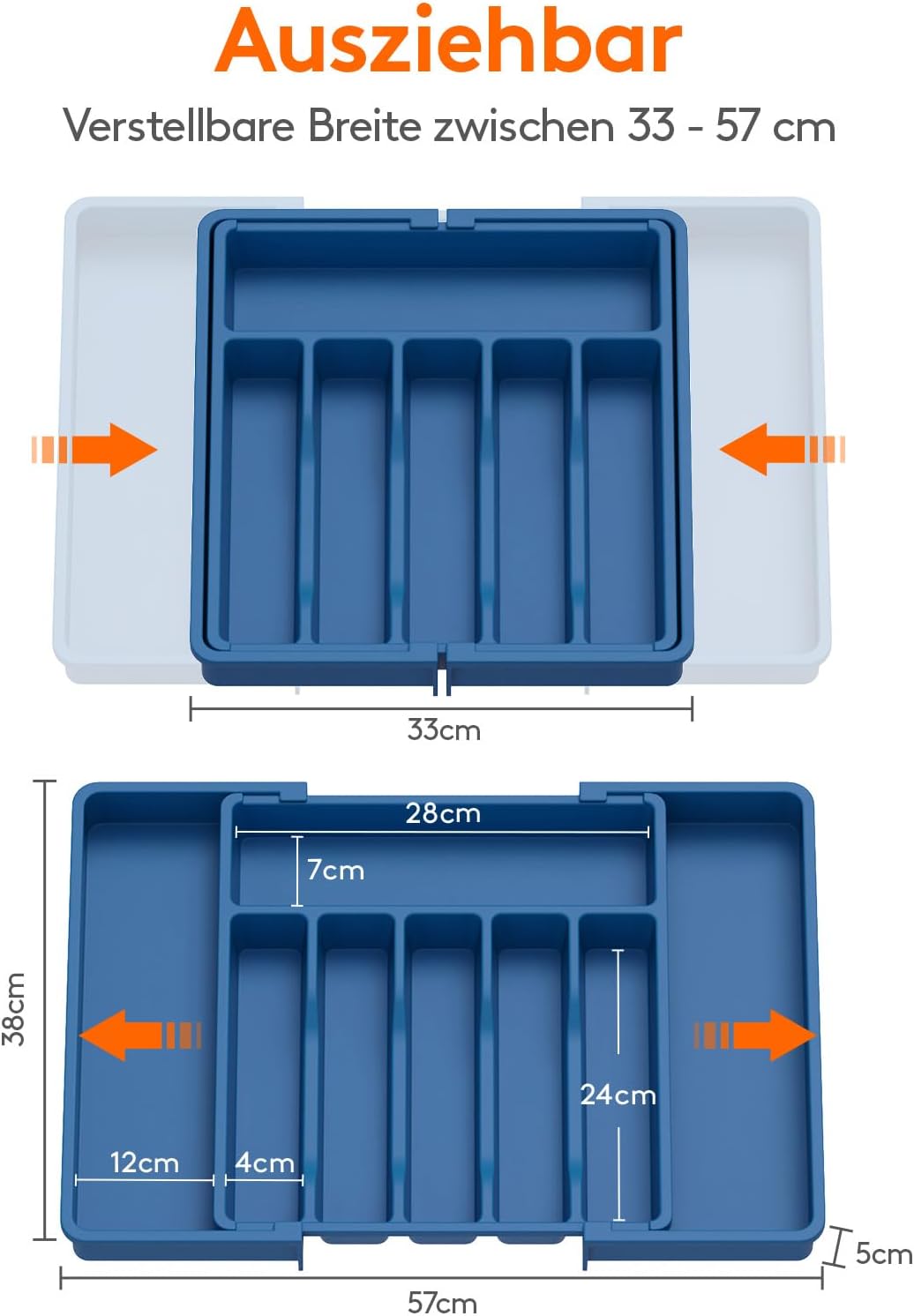 - Verstellbare Grösse: Mit einer verstellbaren Breite von 33 bis 57 cm ist der Besteckeinsatz mit verschiedenen Schubladengrössen kompatibel. Im ausgezogenen Zustand hat der Besteckkasten eine Masse von 57 x 38 x 5 cm und im zusammengeklappten Zustand