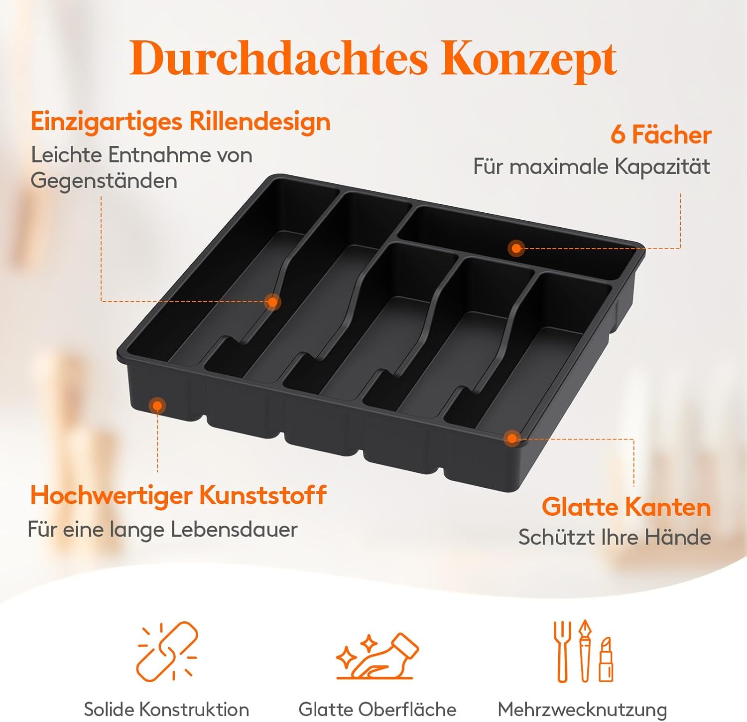 - 6 Fächer zum Sortieren Ihres Bestecks: Der Besteckeinsatz für Schubladen ist in 6 Fächer unterteilt, perfekt zum Sortieren und Aufbewahren von Besteck und Küchenutensilien! Die langen Fächer sind perfekt für Messer und grosse Utensilien, die