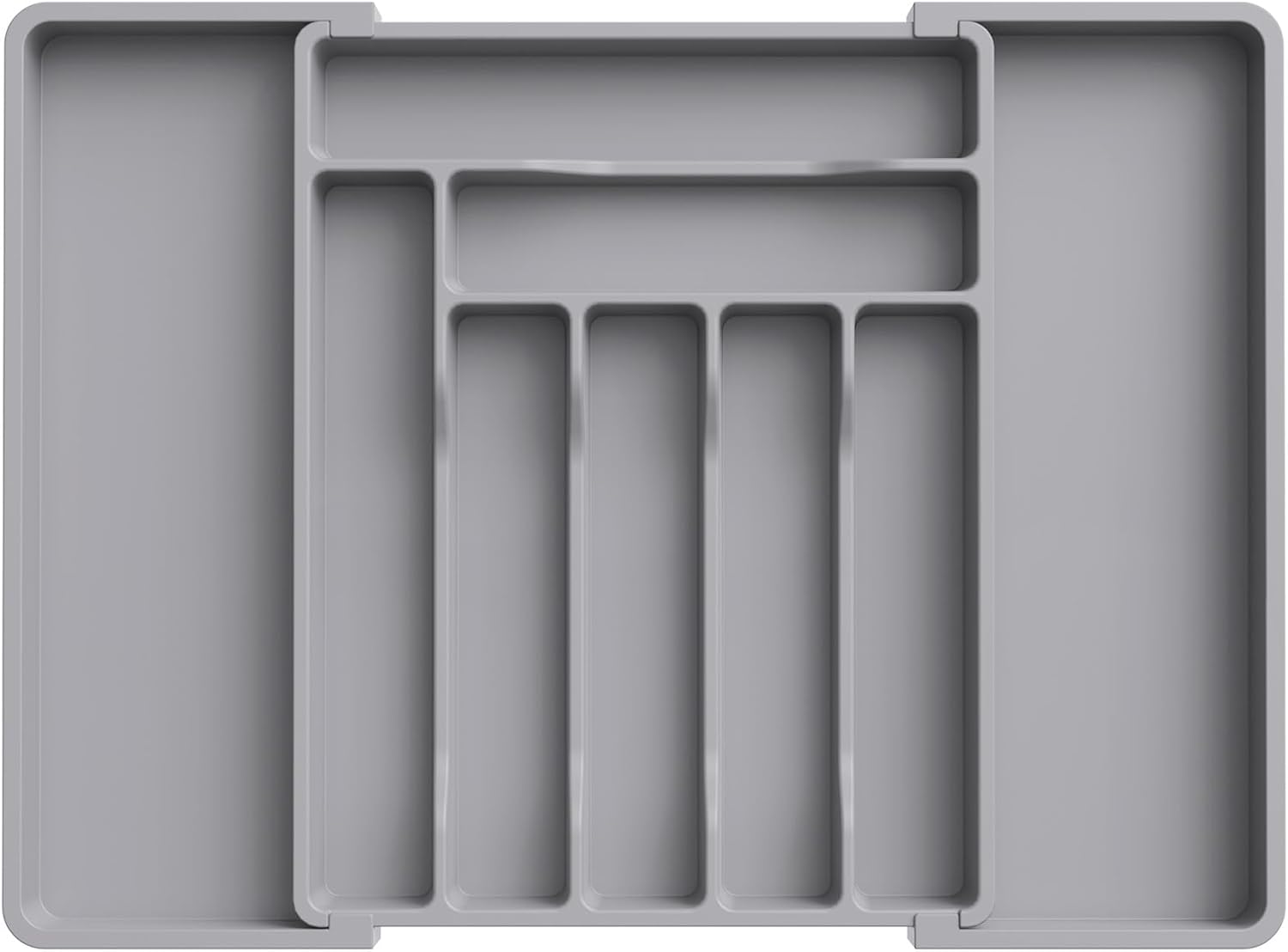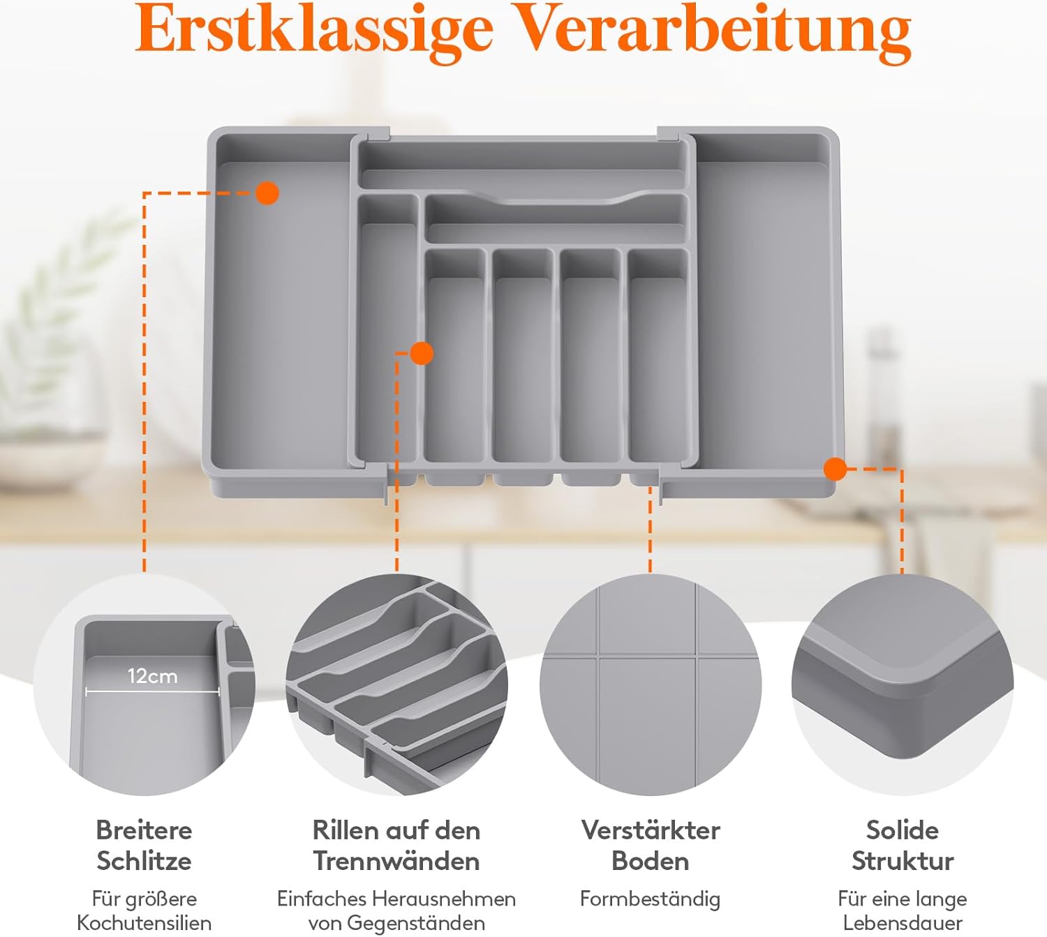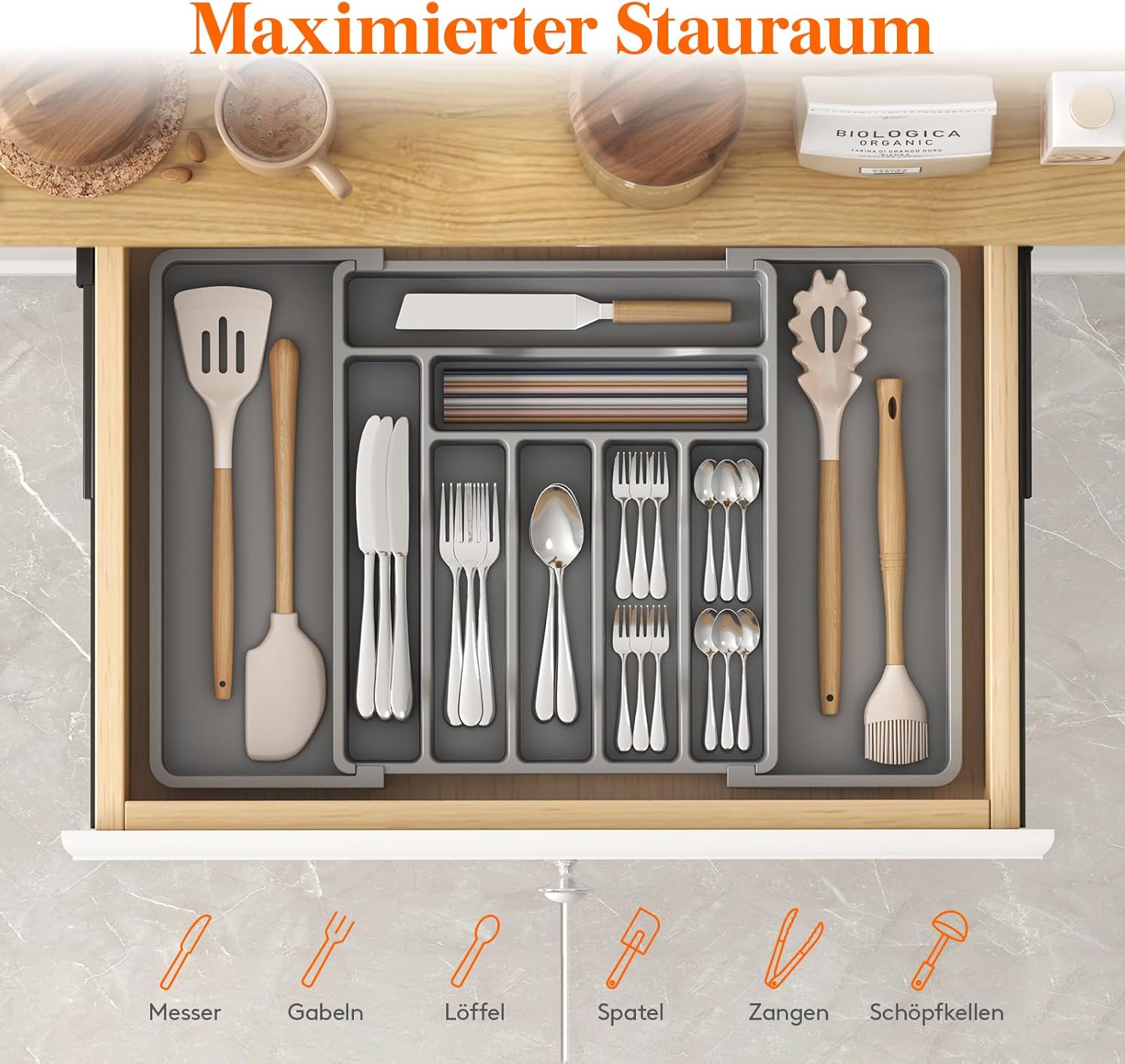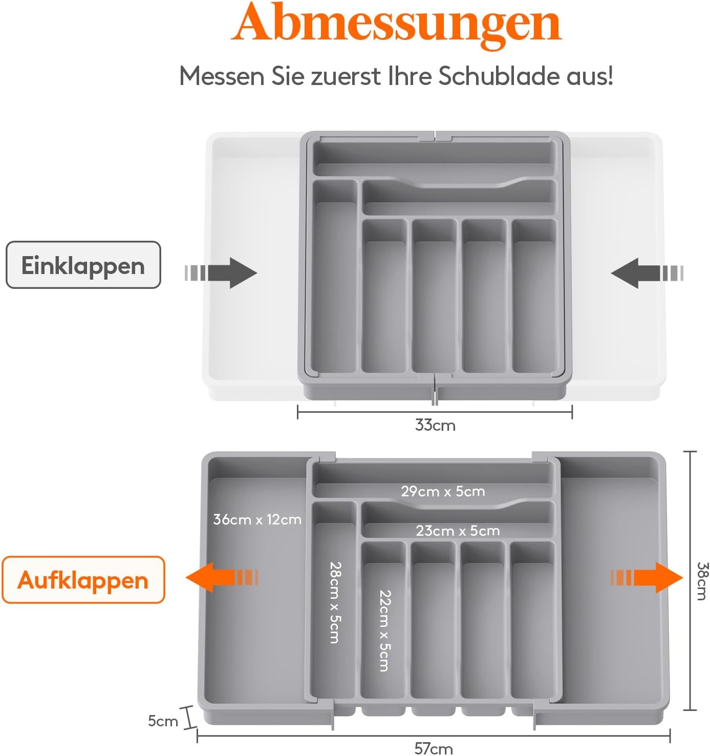 • Erweiterbar auf 9 Fächer: Dieser erweiterbare Schubladeneinsatz passt für die meisten Schubladengrössen, dank einer verstellbaren Breite von 33 - 57 cm. Wenn Sie zusätzlichen Platz für grössere Kochutensilien benötigen, klappen Sie ihn einfach
