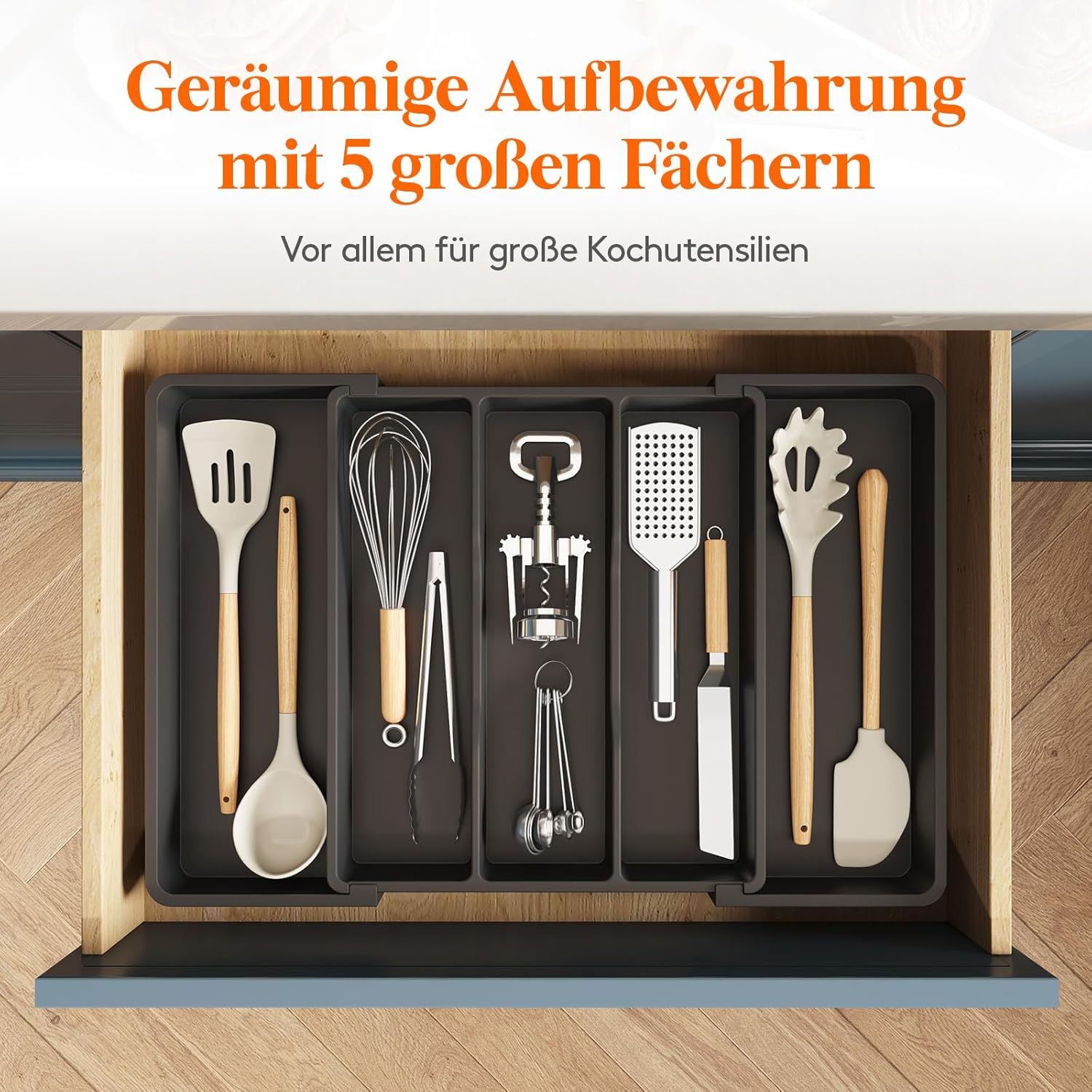 - Perfekt aufgeräumt: Mit 3 grossen Fächern (34 x 9 cm) und 2 erweiterbaren an der Seite (36 x 12 cm) bietet dieser Besteckkasten für Schubladen genug Platz für fast jedes Zubehör Ihrer Küche, wie Pfannenwender, Kellen, Zangen, Zubehörsets und