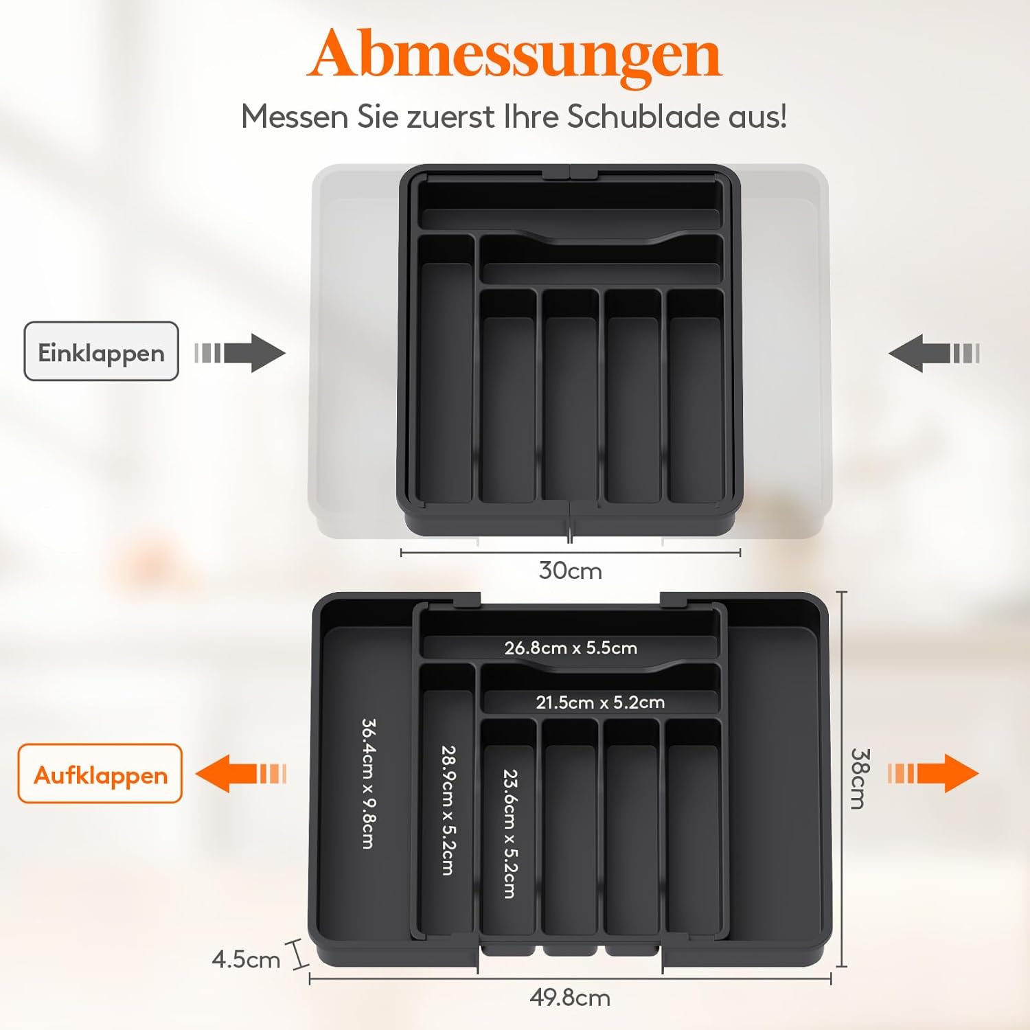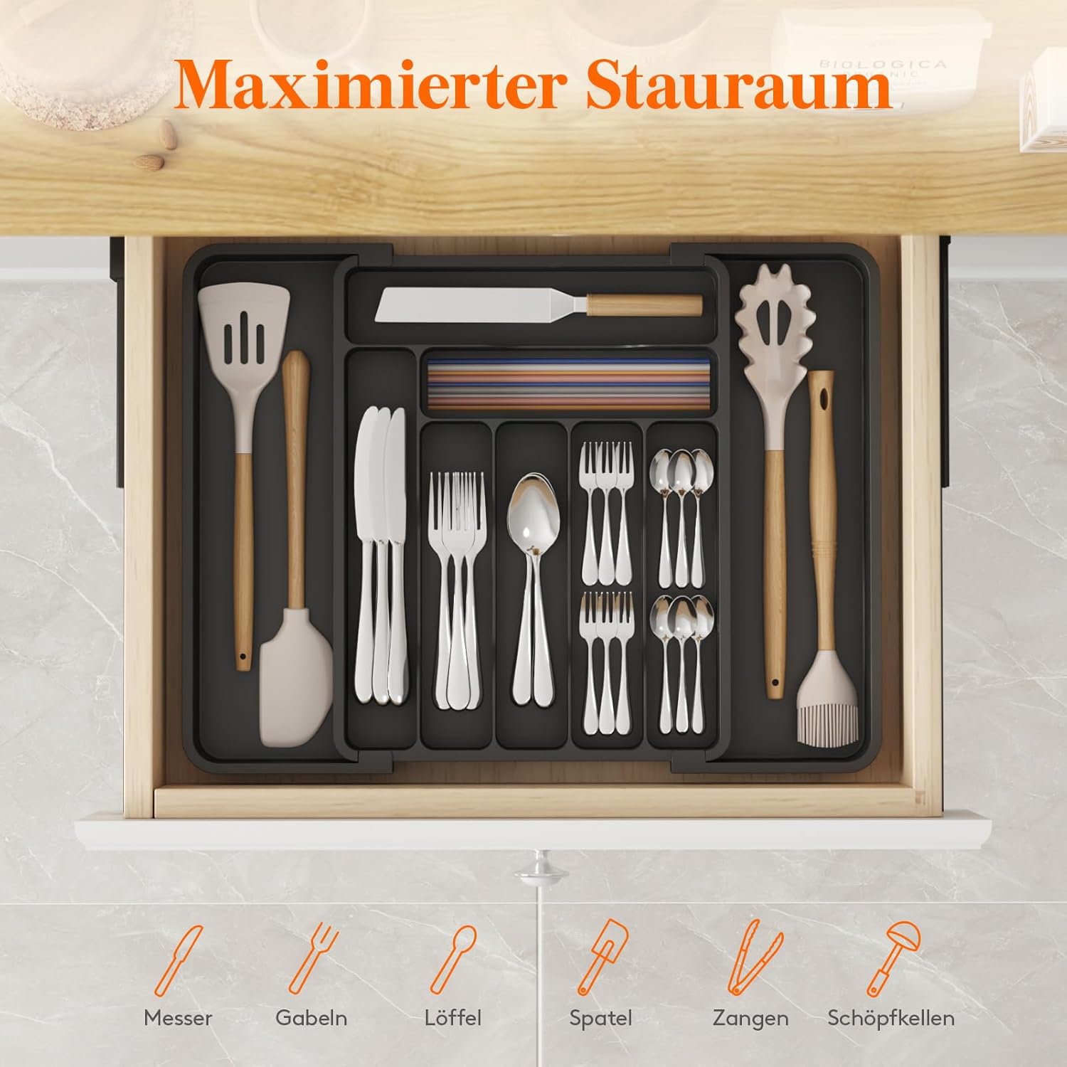 - Erweiterbar auf 9 Fächer: Dieser erweiterbare Schubladeneinsatz passt für die meisten Schubladengrössen, dank einer verstellbaren Breite von 30 - 49,8 cm. Wenn Sie zusätzlichen Platz für grössere Kochutensilien benötigen, klappen Sie ihn einfach