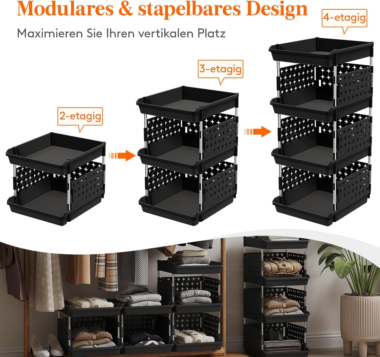 • Stapelbares Konzept: Individualisieren Sie Ihre Lagerung mit unseren stapelbaren Aufbewahrungsboxen dank der anpassbaren Ebenen! Stapeln Sie ganz einfach 4, 3 oder nur 2 Etagen, je nach Ihren Vorlieben. Durch die Nutzung des vertikalen Raums wird die