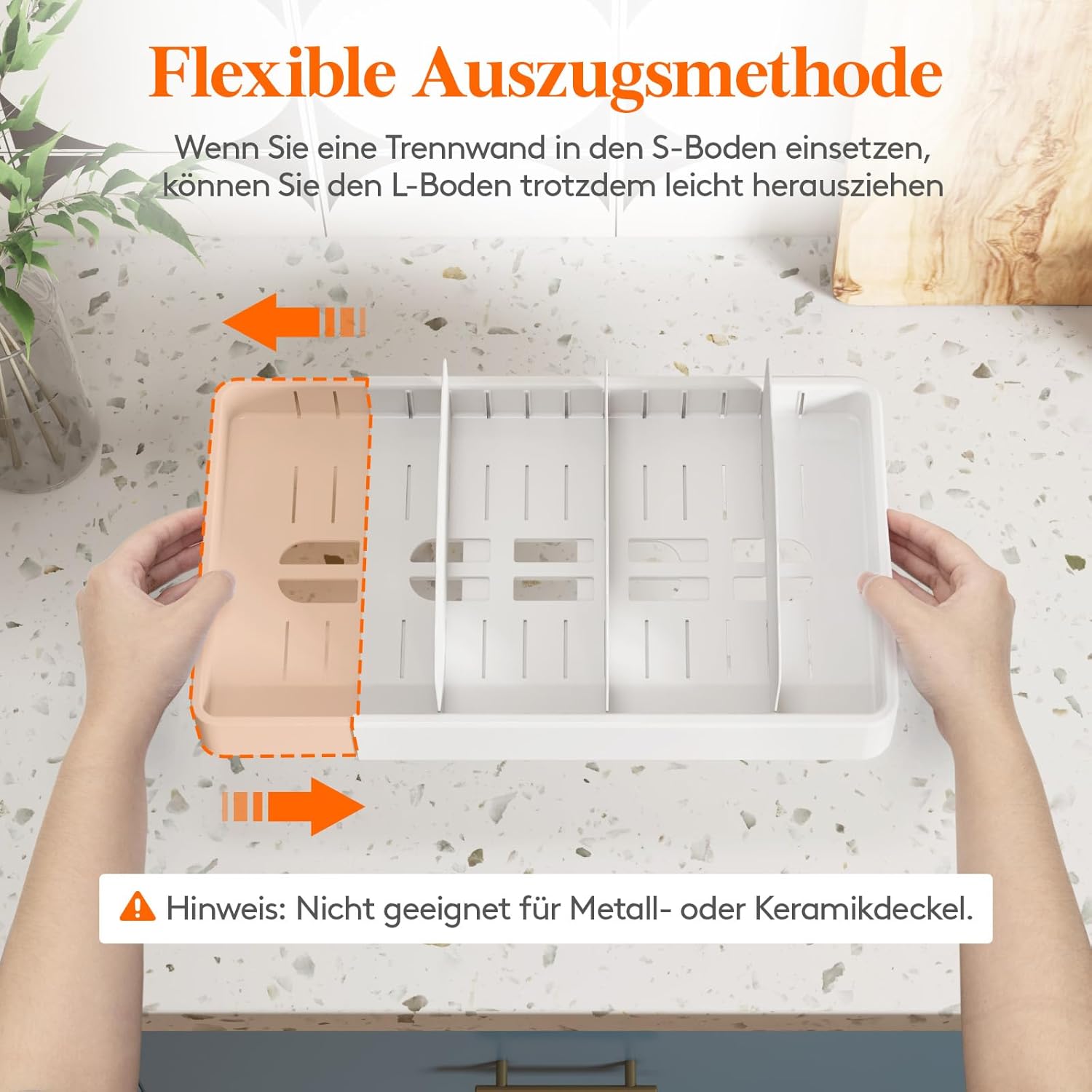 • Verstellbare Trennwände: Mit 8 verstellbaren & stabilen Trennwänden in zwei Grössen (S und L) passt sich dieser Schrank Organizer Küche an und ermöglicht es, kleine, mittlere oder grosse Behälterdeckel ordentlich zu ordnen. Jedes Fach kann bis zu