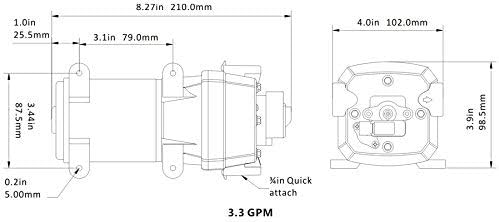- 3,3 Gallonen pro Minute (12,5 Liter pro Minute) 8,0 Max. Ampere. Hinweis: Es ist normal, dass sich in einer neuen Pumpe Wasser befindet, da wir in unserem Werk für jede Pumpe eine Qualitätsprüfung durchgeführt haben.