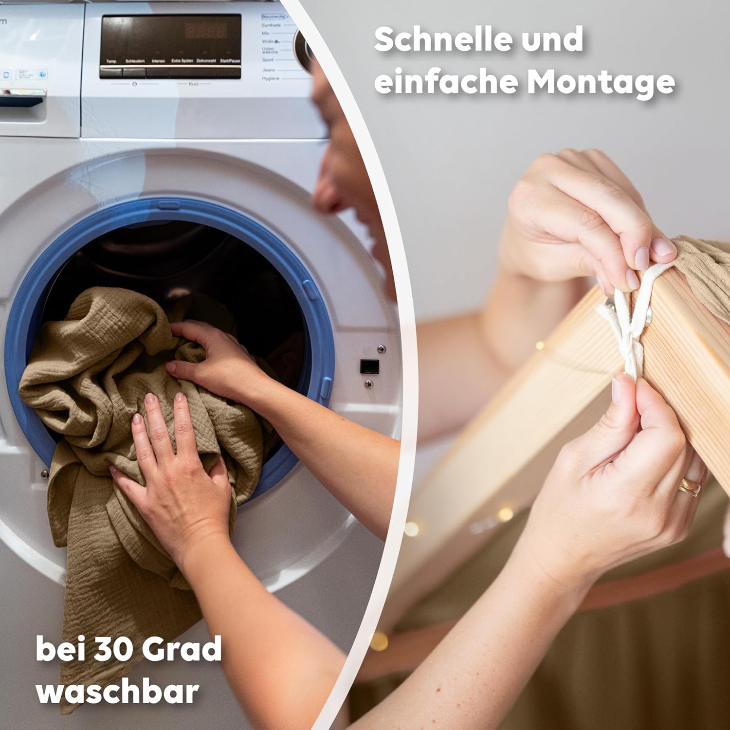 - ๐๐๐๐ฅ๐๐ ๐๐ฅ๐๐ข๐๐ก๐ญ & ๐ฐ๐๐ฌ๐๐ก๐๐๐ซ: Wasche deinen Baldachin bereits vor der Montage bei 30ยฐC im Schonprogramm. Danach Aufhรคngen und einfach trocknen lassen. Kein Bรผgeln notwendig.