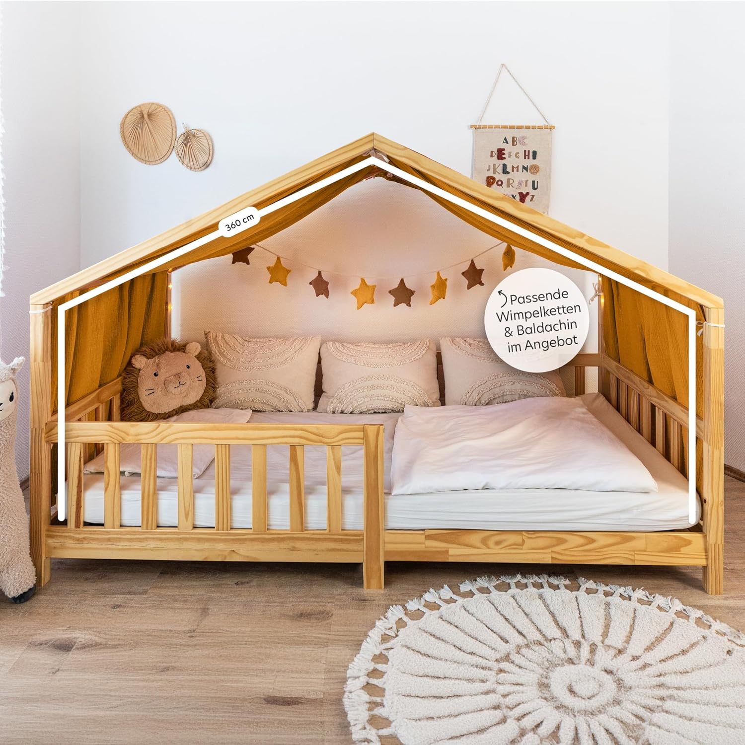 - ✨ 100% MUSSELIN BAUMWOLLE - Unser handgenähter Hausbett Himmel besteht aus weichem, atmungsaktivem Musselin Stoff und schafft eine kuschelige Atmosphäre für Kinder. Perfekt als himmlische Hausbett Deko.