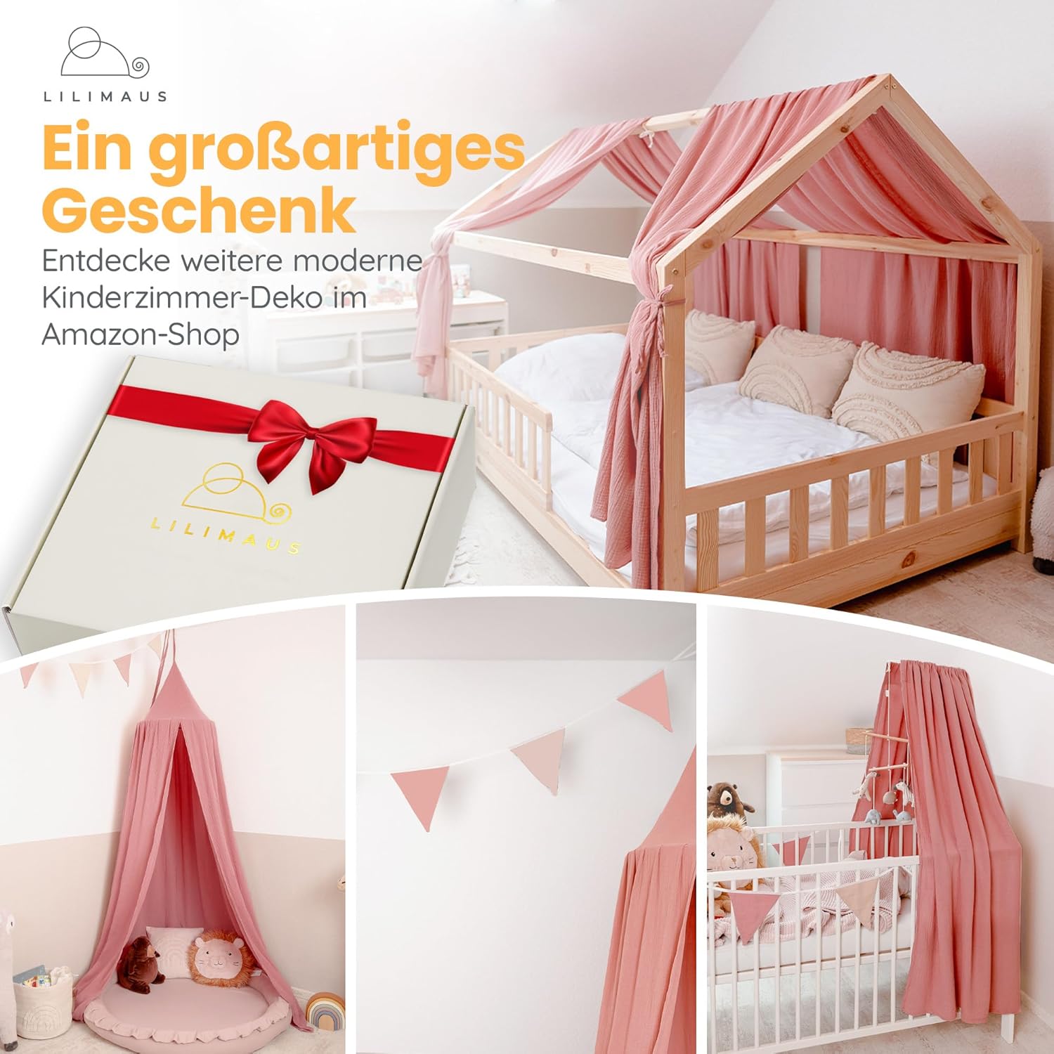 - ✨ 100% MUSSELIN BAUMWOLLE - Unser handgenähter Hausbett Himmel besteht aus weichem, atmungsaktivem Musselin Stoff und schafft eine kuschelige Atmosphäre für Kinder. Perfekt als himmlische Hausbett Deko.