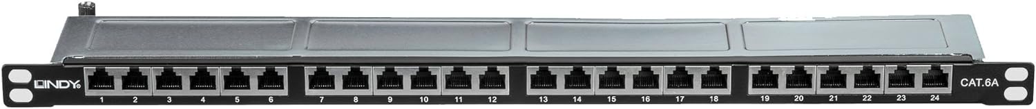 - Massives Metallgehäuse, Front schwarz 19", 1/2 Höheneinheit, erlaubt die Montage von 2 Panels mit 48 Ports in 1HE 24 Ports RJ45 STP Cat. 6A Gigabit kompatibel, In 4 Gruppen A 6 Ports Klasse EA kompatibel, bis 10Ge. Kompatibel bis 500MHz nach ISO/IEC