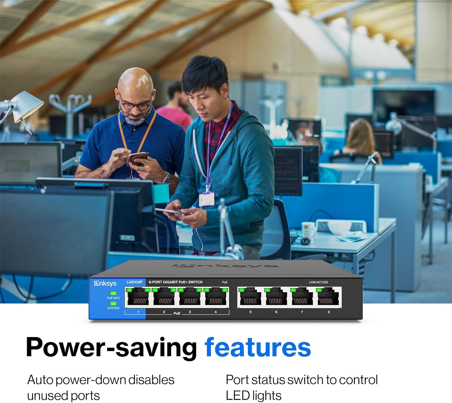 - Energieeffizient: Die Abschaltfunktion deaktiviert nicht genutzte Ports automatisch. PoE+ erfordert nur ein Kabel zur Übertragung von Daten und Strom, sodass keine Steckdose benötigt wird
