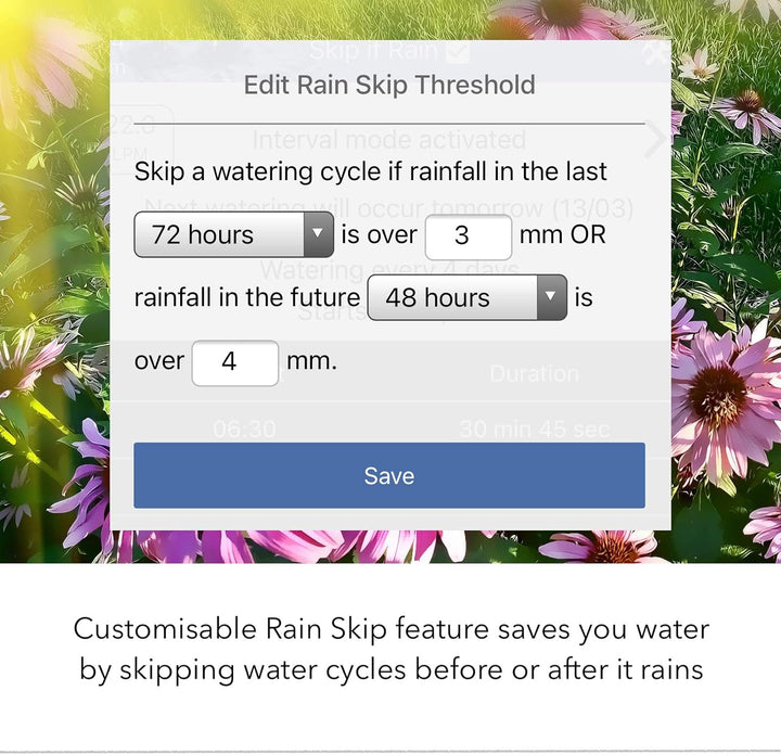 - 💧 LEISTUNGSFÄHIGE BEWÄSSERUNGSSTEUERUNG - Flexible Bewässerungsoptionen per benutzerfreundlicher Handy -oder Web-Apps: Sofort-Start/Stopp, Einstellung bestimmter Tage, Zeiten & Bewässerungsdauer – sie haben es in der Hand