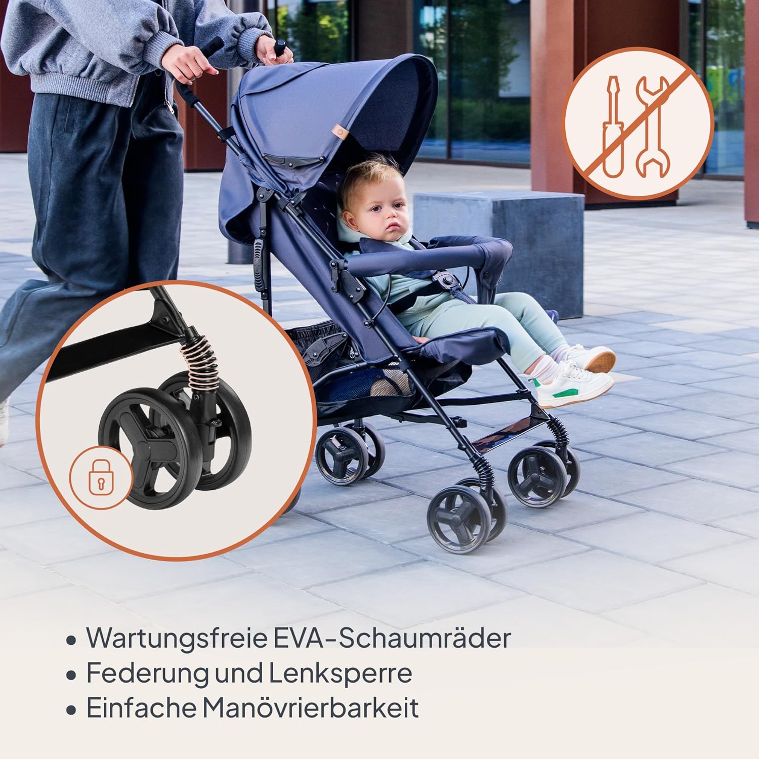 - ROTATIONSSPERRE UND HINTERRADBREMSE: An der Hinterachse befindet sich eine bequeme und schnell zu bedienende Bremse, die mit einem Fuss betätigt wird. Vorderrad hat eine Rotationssperre, die bei unebenem Gelände hilfreich die Spur hält