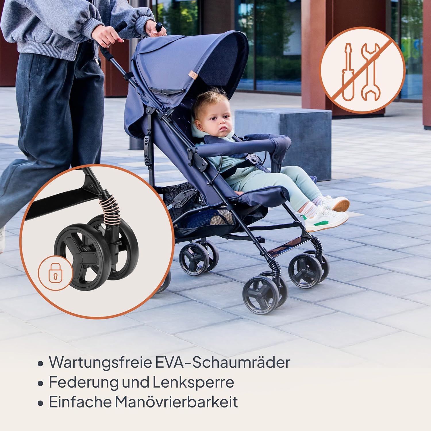 - ROTATIONSSPERRE UND HINTERRADBREMSE: An der Hinterachse befindet sich eine bequeme und schnell zu bedienende Bremse, die mit einem Fuss betätigt wird. Vorderrad hat eine Rotationssperre, die bei unebenem Gelände hilfreich die Spur hält