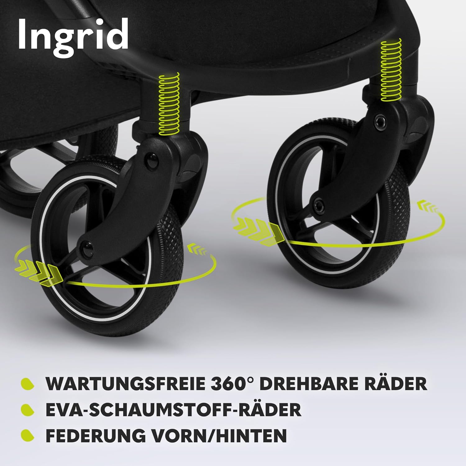 - HERVORRAGENDE HANDHABUNG: Der zusammenklappbare Kinderwagen INGRID ist mit grossen wartungsfreien EVA-Rädern mit einem Durchmesser von 15 und 19,5 cm ausgestattet, die sich für eine Vielzahl von Oberflächen eignen. Die Fähigkeit, den Wagen um 360°