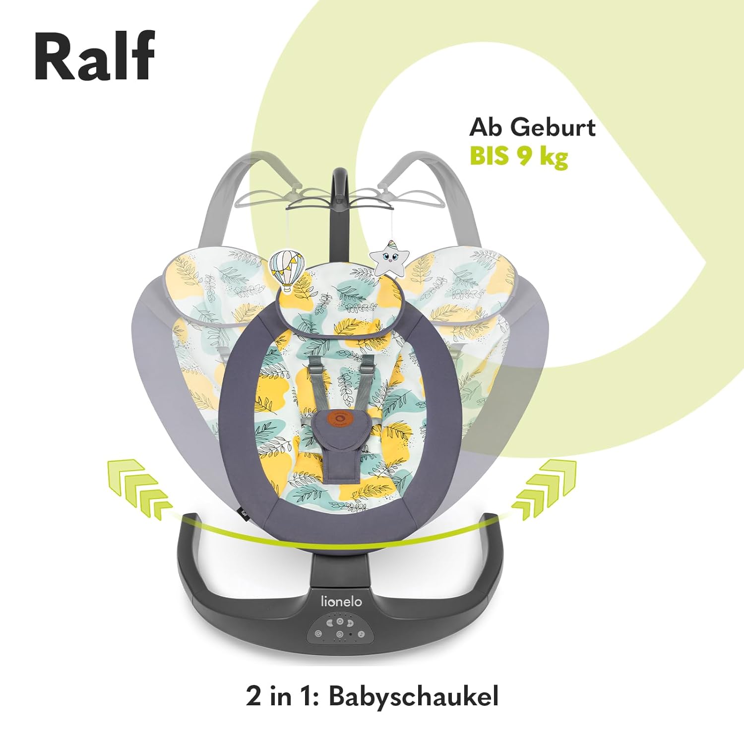 - LIONELO RALF: Multifunktionale Automatikwippe und Liegestuhl in einem. Das Produkt ist mit einem Spielzeugbogen mit zwei Spielzeugen, 12 eingebauten Melodien und fünf automatischen Schaukelmodi ausgestattet. Batterie- oder Netzbetrieb über USB-Eingang