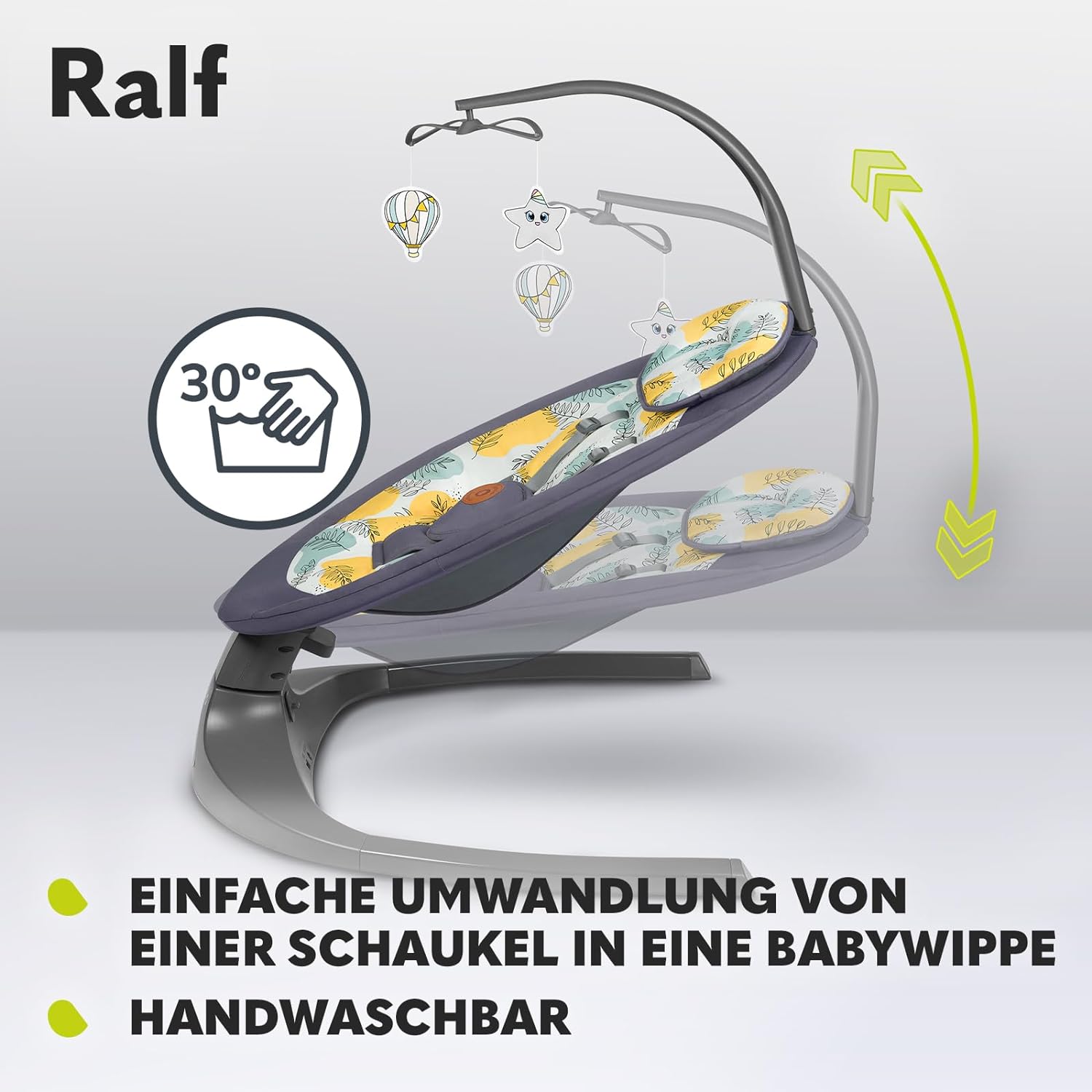 - WIPPFUNKTION: Ralf lässt Sie in zwei Richtungen schwingen: rechts-links. Ausgestattet mit einem Touch-Bedienfeld, einer Fernbedienung, 12 Melodien und einem Timer, der auf 8, 15 oder 30 Minuten eingestellt werden kann