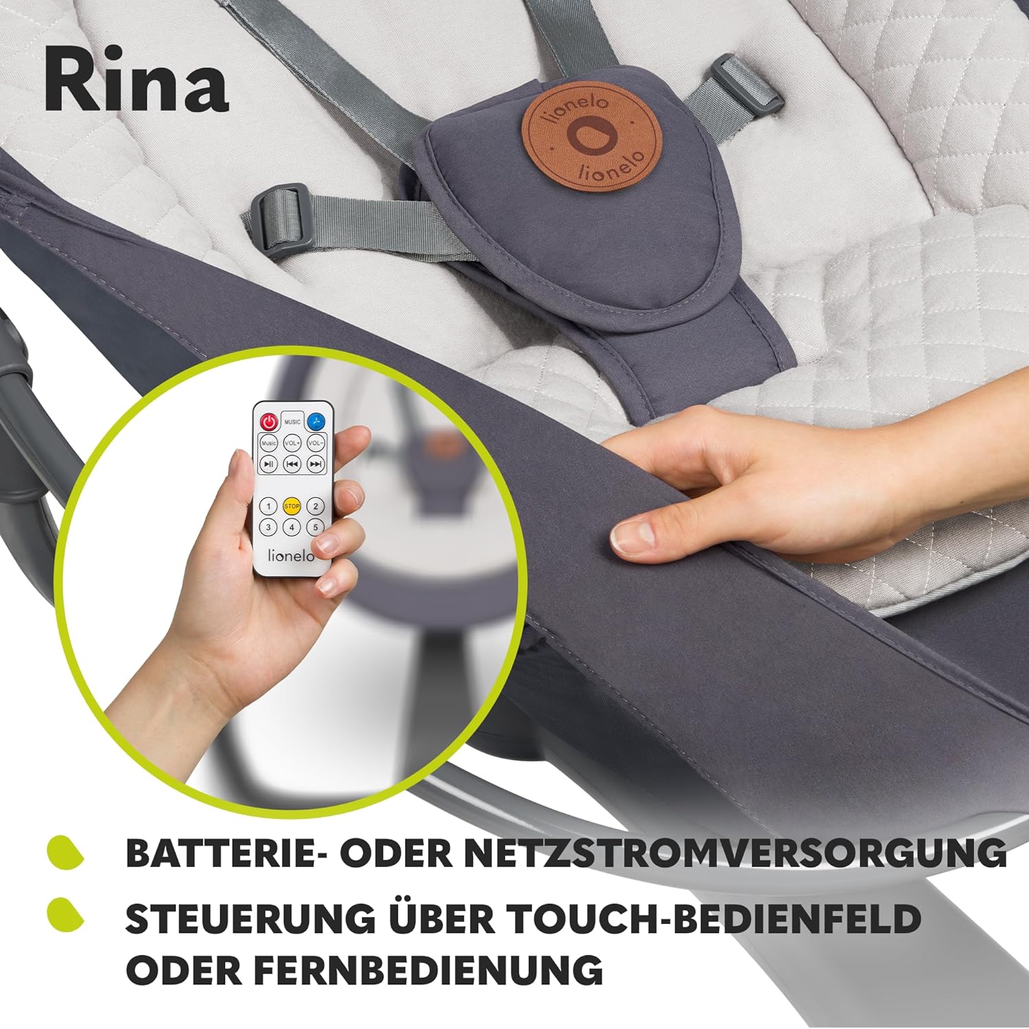 - LIONELO RINA: Praktische und bequeme automatische Wippe mit Liegefunktion. Ausgestattet mit einem um 360° drehbaren Sitz, einem luftigen Netzbezug, einem Spielzeugbogen mit Spielzeugen, 12 Melodien und mehreren automatischen Schaukelmodi. Batterie- oder