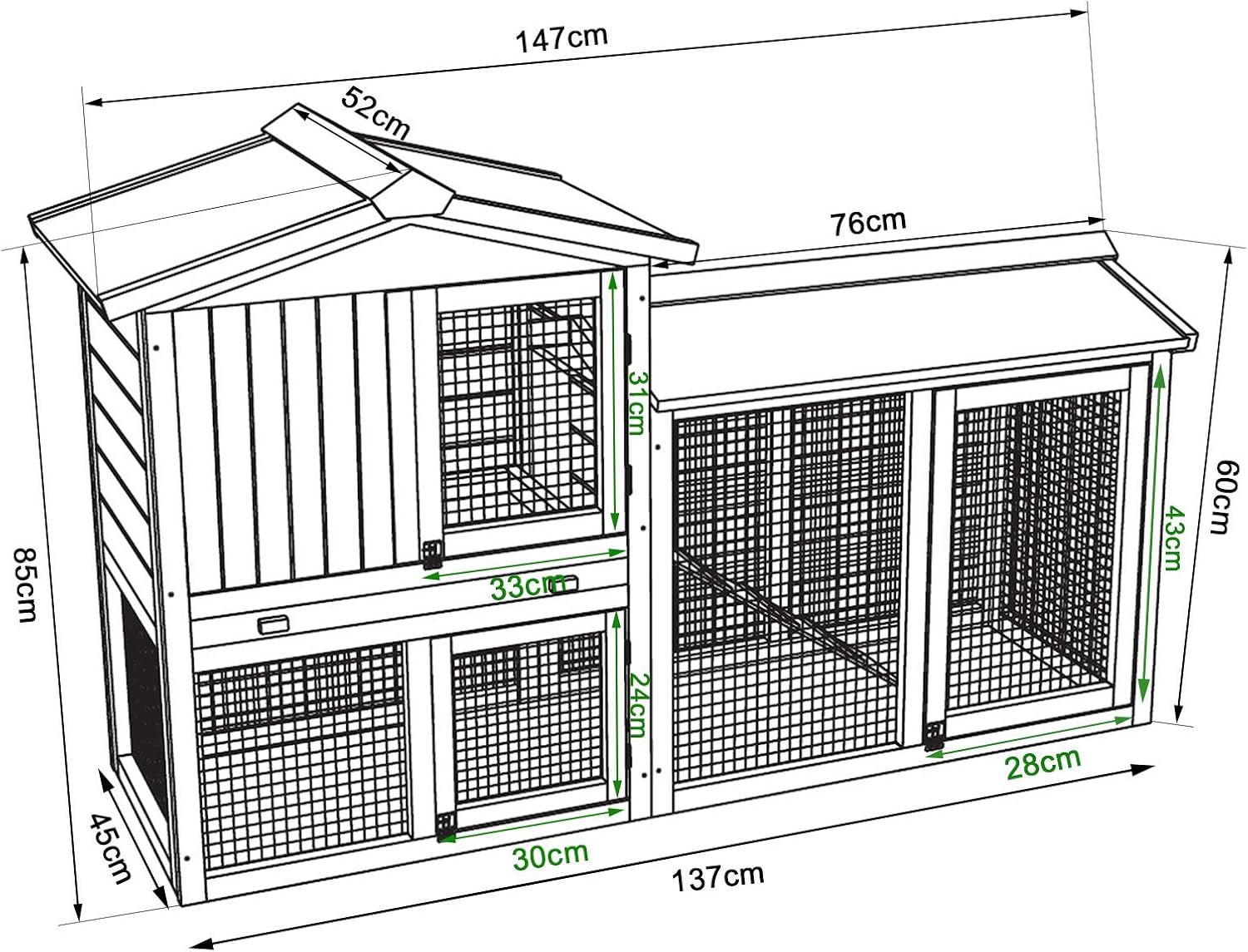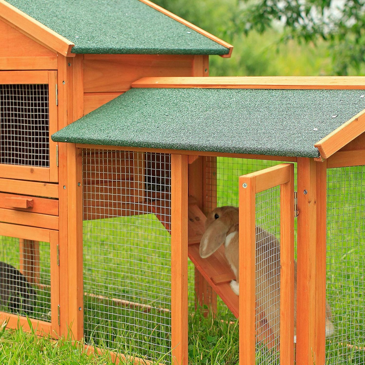 Der dibea Outdoor-Kaninchenstall ist ideal für Ihre Kaninchen und Kleintiere geeignet, die beim Aussenauslauf einen überdachten Platz brauchen. So haben Sie jederzeit eine Hütte zum Spielen und Verstecken, die durch ihre wetterfesten Eigenschaften vor Wind und Regen schützt. Das Dach des Kleintierhauses ist mit wasserabweisenden Bitumenplatten versehen. Mit 3 Türen haben Sie jederzeit schnellen Zugriff auf Ihre Vierbeiner. Das Drahtgitter rundum schützt vor einem Weglaufen der Tiere und zugleich können Sie und die Nager alles beobachten. Ebenfalls werden sie so vor dem Zugriff von Raubtieren geschützt. Der offene Boden im unteren Bereich ermöglicht den Kaninchen den direkten Rasenkontakt zum Spielen und Grasen. Eine Lauframpe führt zur oberen Etage, die als ideale Rückzugsmöglichkeit dient. Der Boden ist eine herausziehbare Schublade aus Metall, die zur Reinigung simpel herausgenommen werden kann. Bitte beachten Sie, dass Kaninchenställe nicht zur dauerhaften, artgerechten Unterbringung von Kaninchen geeignet sind. Sie können Freilaufgehege nutzen, die Sie ebenfalls bei uns erwerben können. Im Lieferumfang enthalten: 1 x Hasenstall, Montageset, Aufbauanleitung Mehr lesen