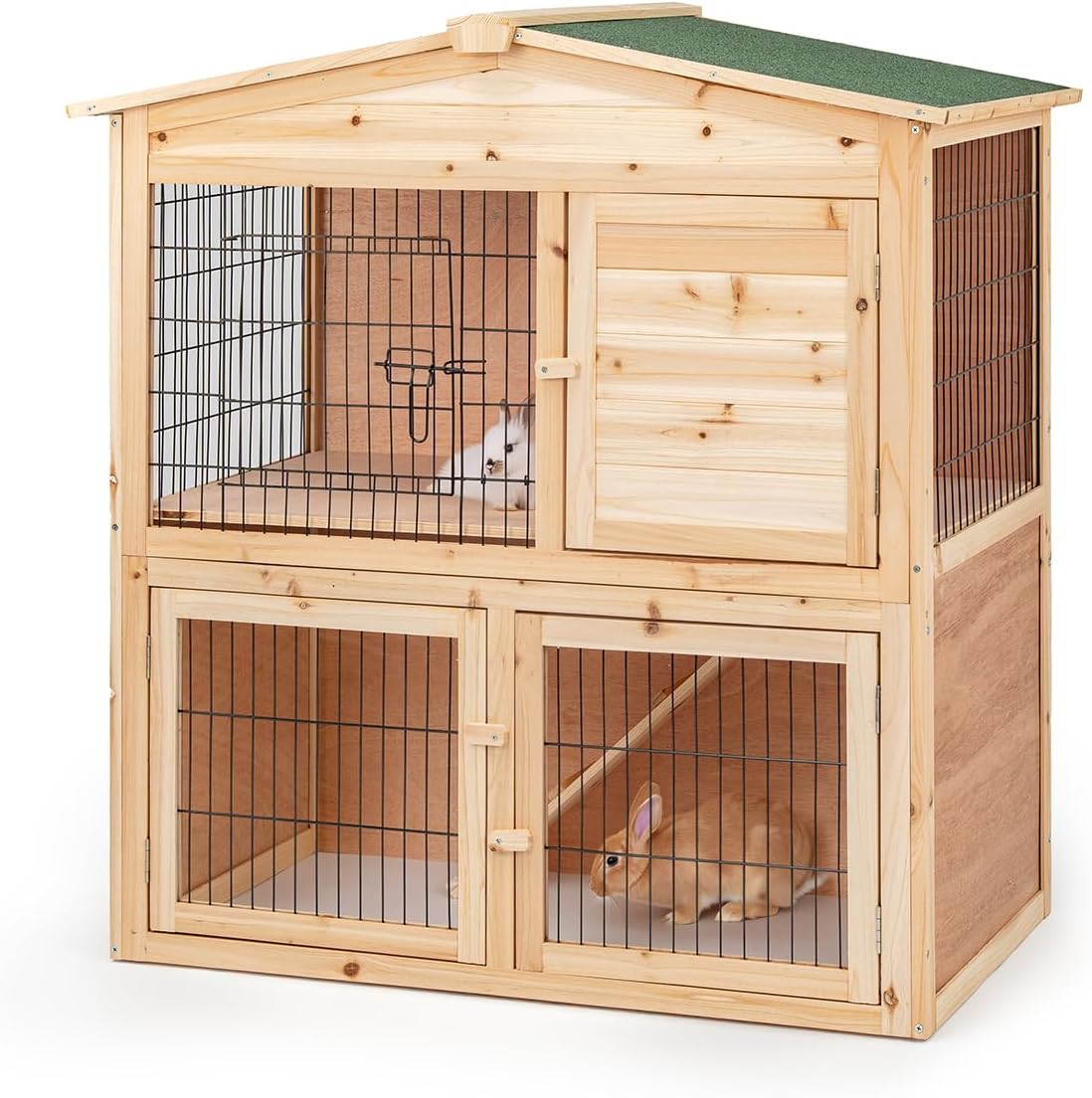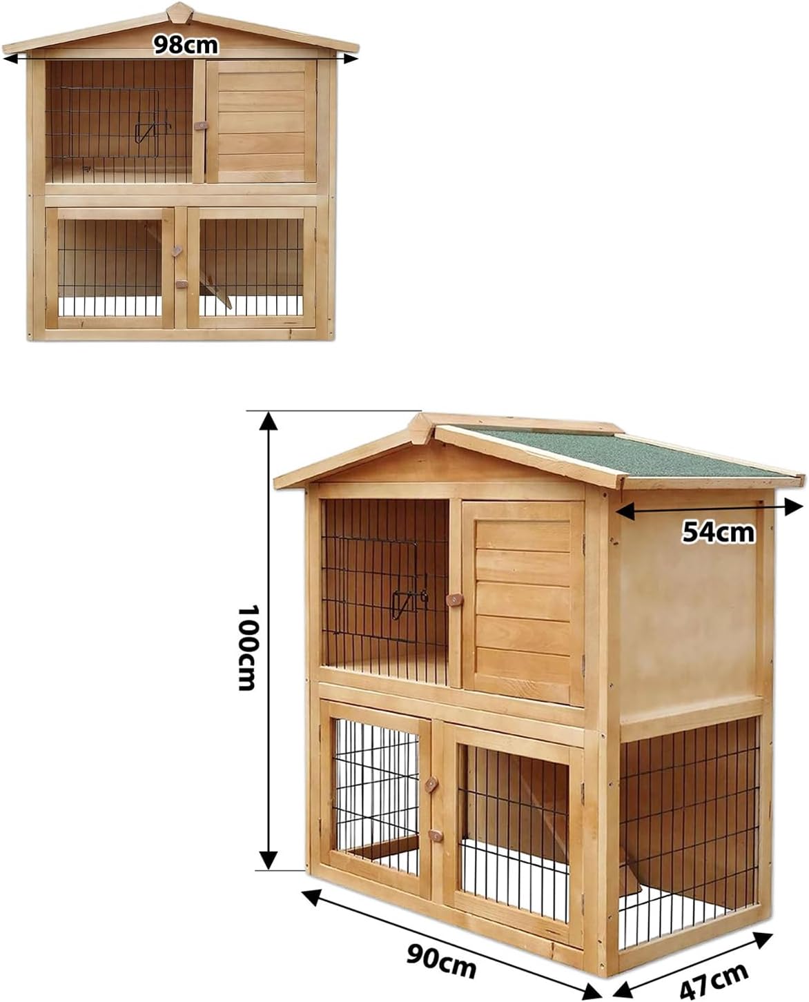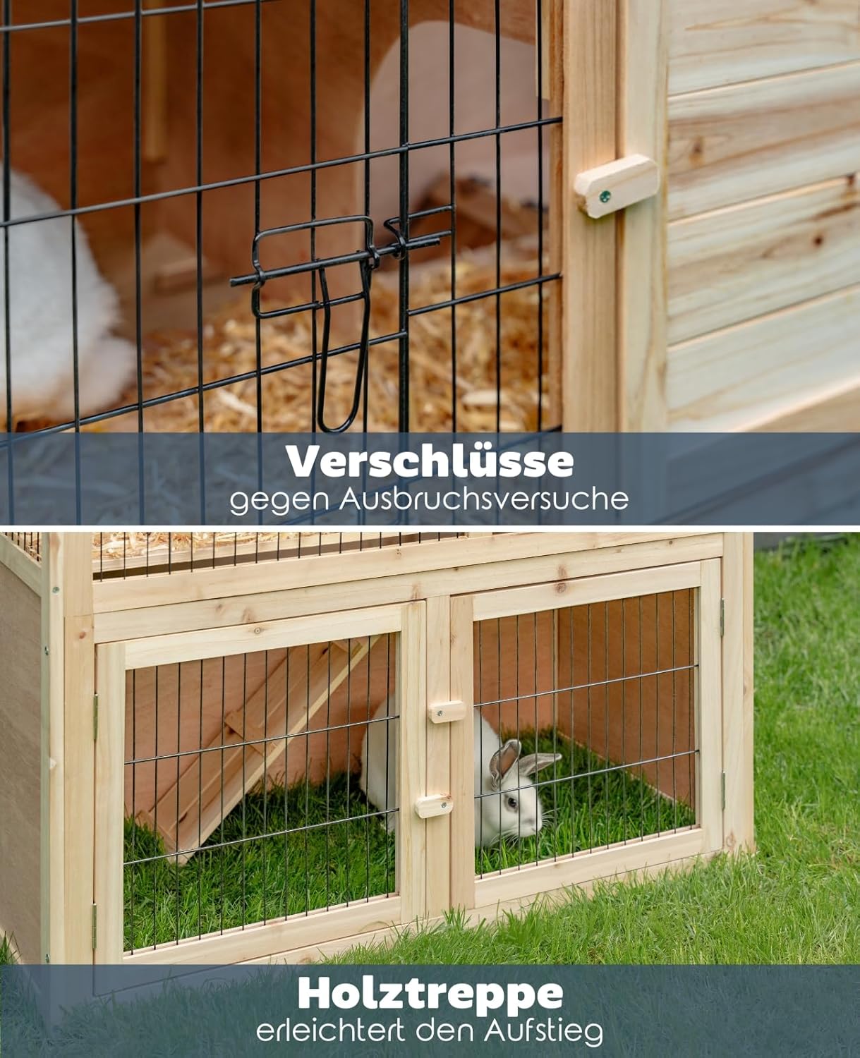 Der lionto Outdoor-Kaninchenstall mit 2 Etagen ist ideal für Ihre Kaninchen und Kleintiere geeignet, die beim Aussenauslauf einen überdachten Platz brauchen. So haben Sie jederzeit eine Hütte zum Spielen und Verstecken, die durch ihre wetterfesten Eigenschaften vor Wind und Regen schützt. Eine Rampe führt zur oberen Etage, die sichtgeschützt ist und aus 2 Räumen mit Durchgang besteht. So können sich Ihre Lieblinge auch mal zurückziehen. Mit insgesamt 4 Türen können Sie jederzeit schnell an Ihr Tier gelangen. 2 davon befinden sich oben und 2 unten. Der Eisendraht rundum hindert die Tiere am Weglaufen, ermöglicht sowohl den Tieren als auch Ihnen freie Sicht und schützt die Nager vor Raubtieren. Der offene Boden im unteren Bereich lädt zum Spielen und Grasen ein. Bitte beachten Sie, dass Kaninchenställe nicht zur dauerhaften, artgerechten Unterbringung von Kaninchen geeignet sind. Sie können Freilaufgehege nutzen, die Sie ebenfalls bei uns erwerben können. Im Lieferumfang enthalten: 1 x Kaninchenstall, Montageset, Aufbauanleitung Mehr lesen