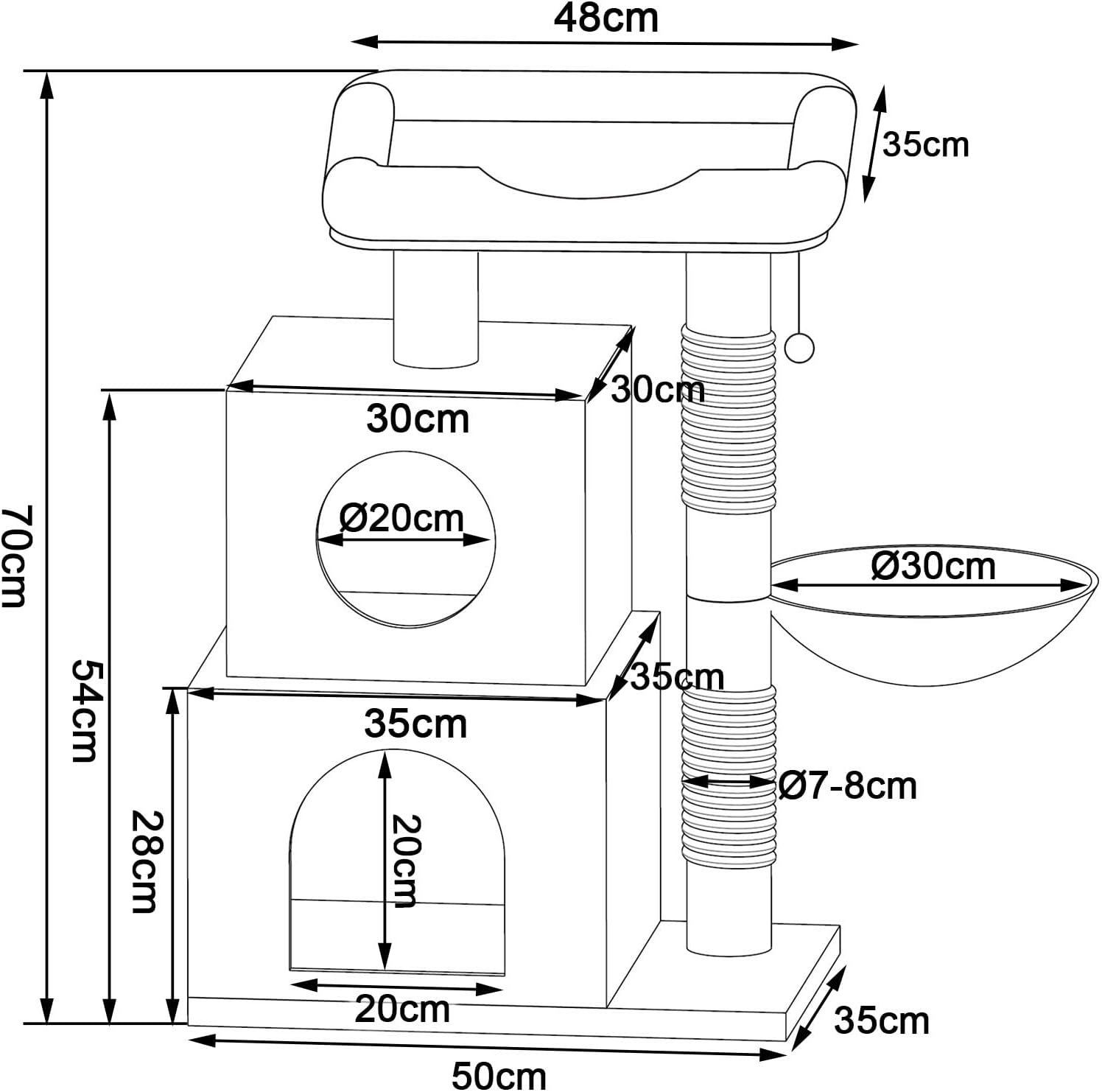 - MAssE UND FARBEN. Dieses hochwertige Katzenzubehör verfügt über die Masse 50x35x70 cm, die Höhlen über 30x30x25 cm / 35x35x25 cm und das Plateau 40x30 cm. Das langlebige Katzenspielzeug ist in den Farben hellgrau und dunkelgrau erhältlich.