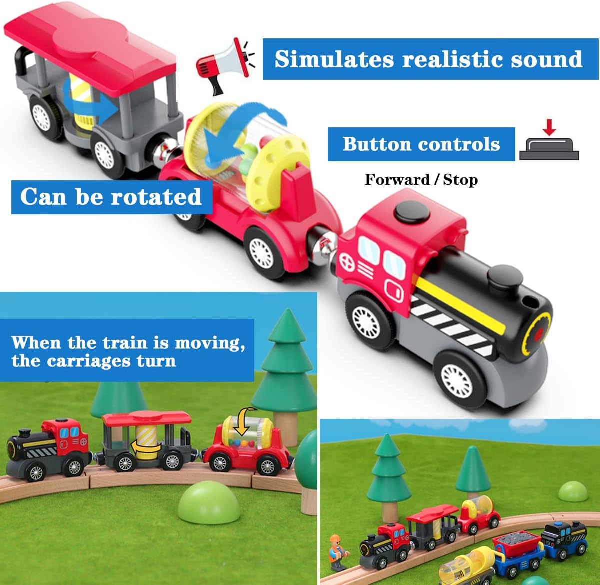 - đăBatteriebetriebene ZĂŒgeă- Die Lokomotive dieses Zugsets wird mit einer 1*AAA-Batterie betrieben (nicht im Lieferumfang enthalten). Die Lokomotive und die Waggons sind magnetisch miteinander verbunden. Sie können durch DrĂŒcken eines Schalters