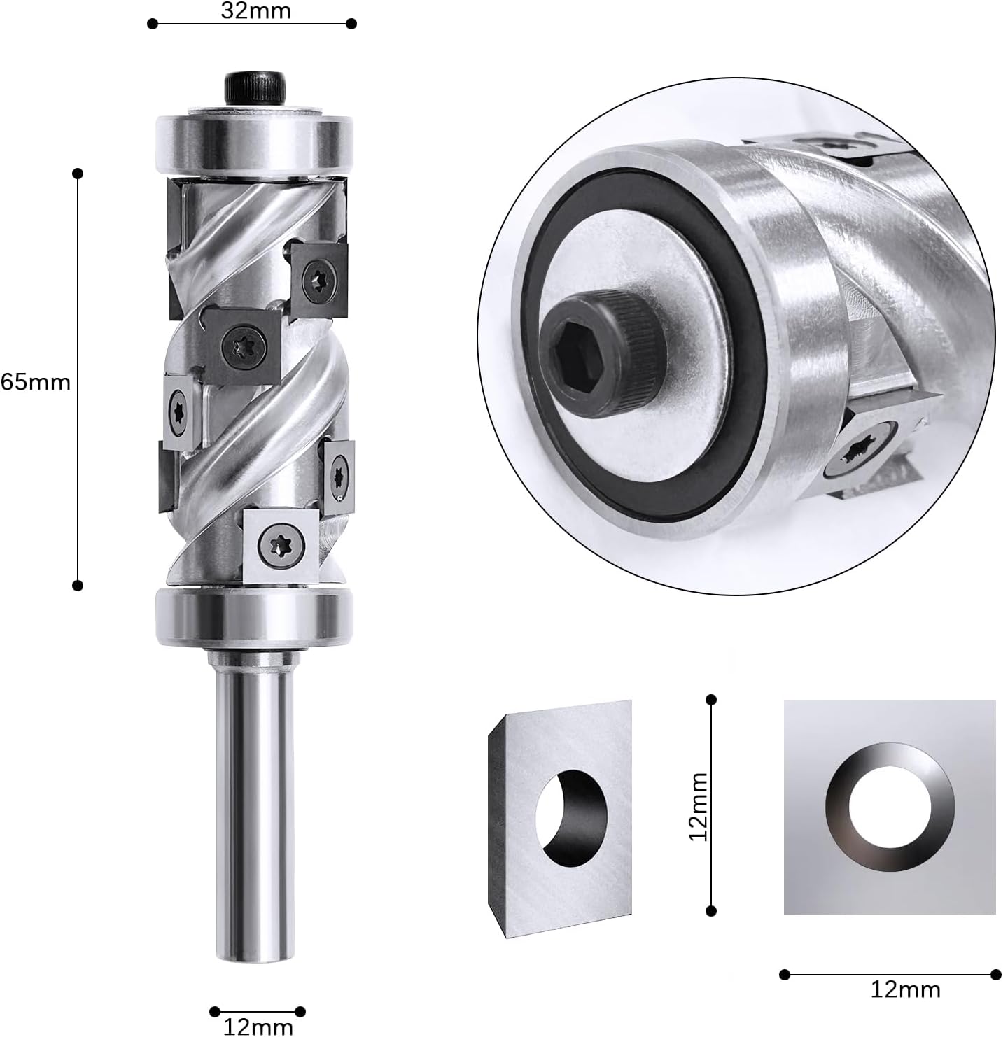 - GRÖSSE: Der Bündigfräser hat 12 mm Schaftdurchmesser, 32 mm Schneiddurchmesser und 65 mm Schneidlänge. Wolframcarbid-Wendeplatten 12mmx12mmx2.2mm.
