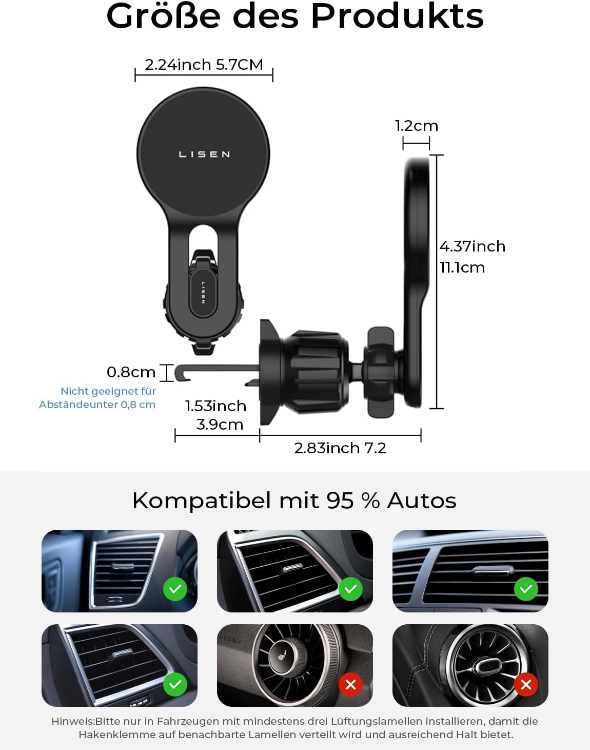- Kompatibel mit horizontalen und vertikalen Lüftungsöffnungen: Der Stahlhaken-Clip dieser Handyhalterung für das Auto ist 50% länger als der gewöhnliche. Es ist kompatibel mit den meisten horizontalen und vertikalen Lüftungsöffnungen, die die