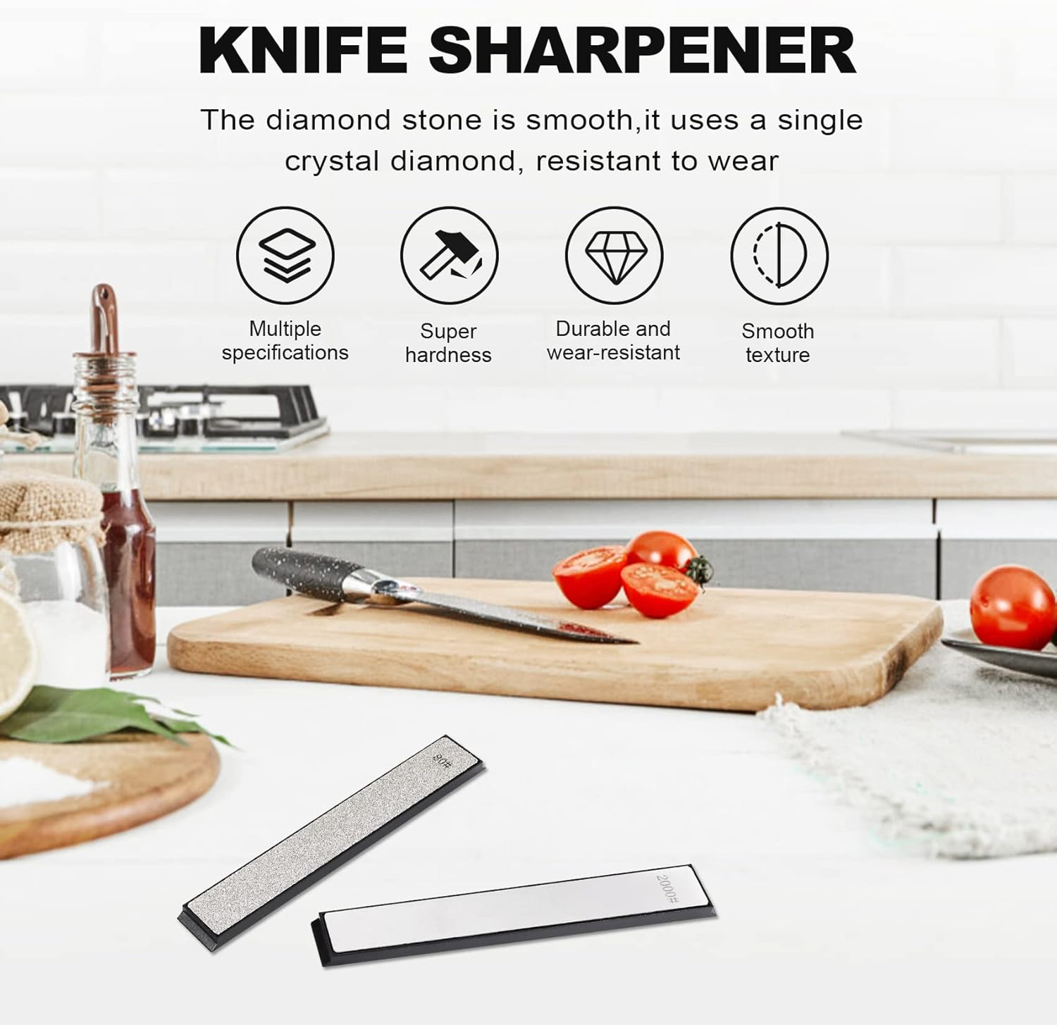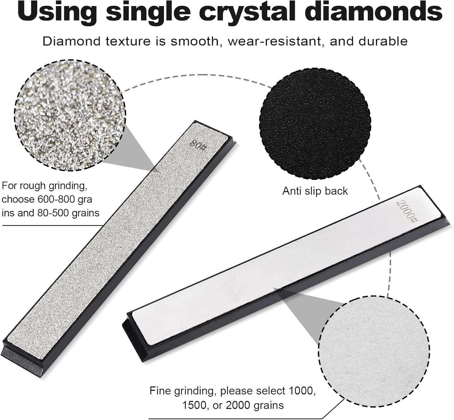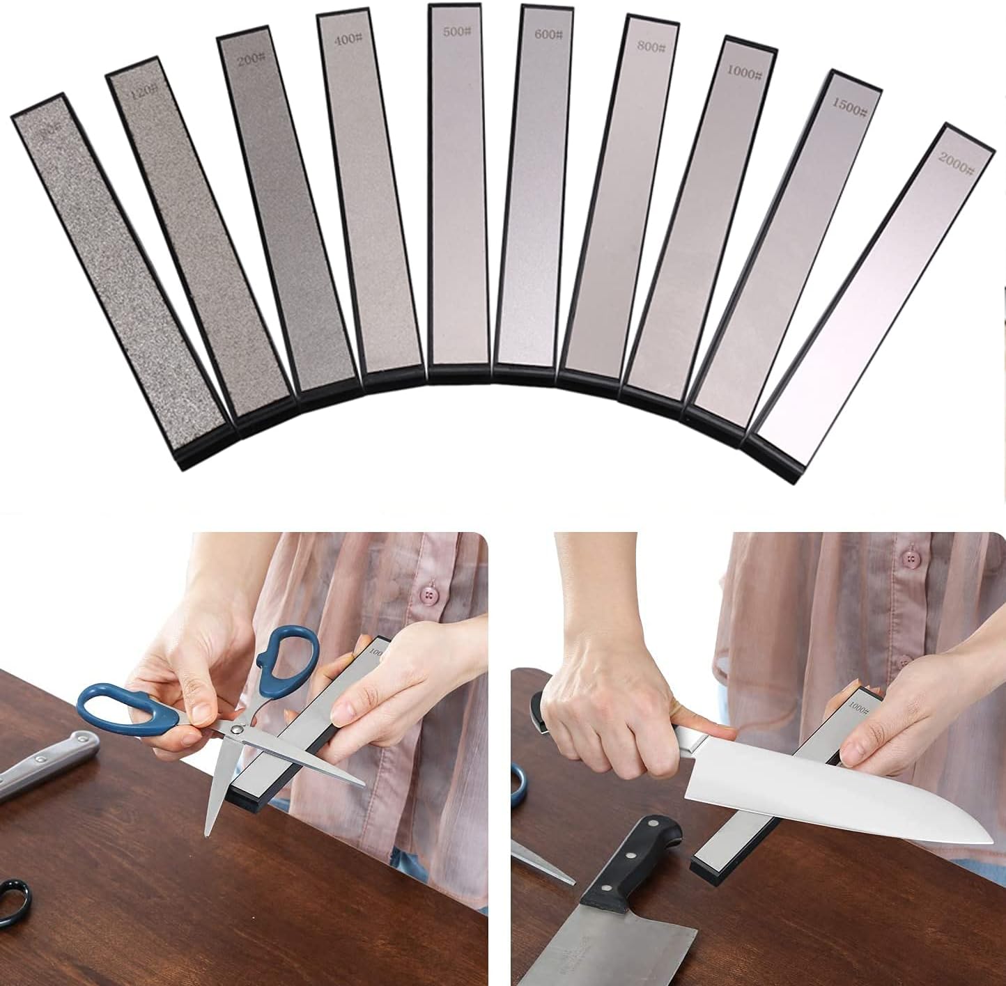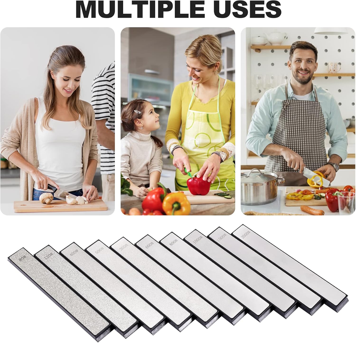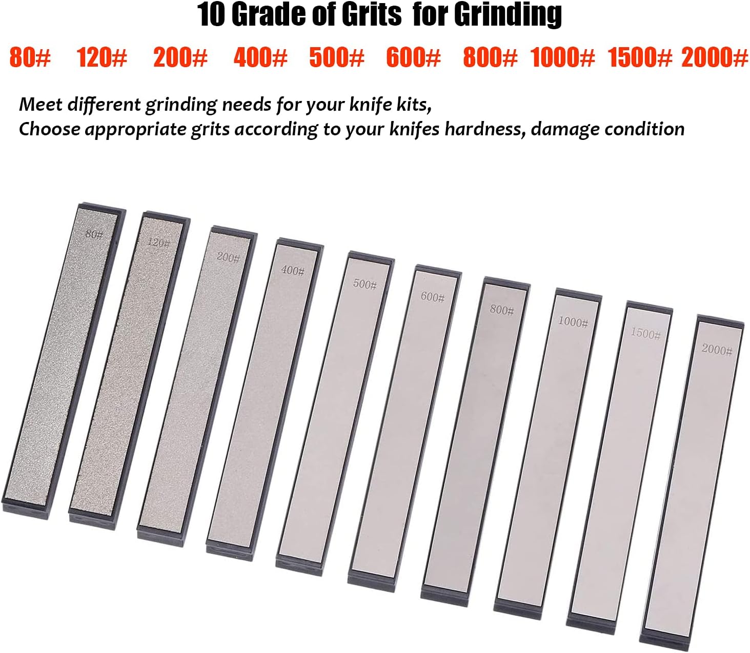 - ✤ Erfüllen Sie unterschiedliche Schleifanforderungen für Ihre Messersets, wählen Sie 1000 1500 2000 Körnung, wenn Sie fein schleifen oder polieren, 600-800 Körnung, wenn Sie grob schleifen, 80-500 Körnung.