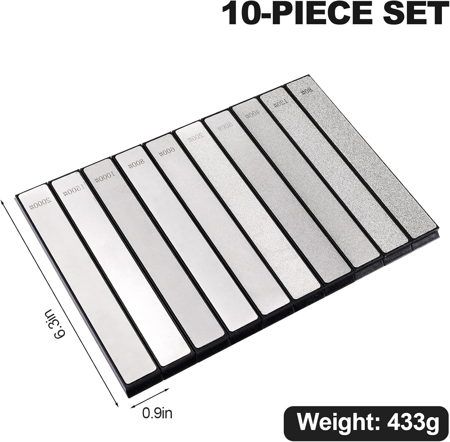 - ✤ Das Paket enthält 10 Schleifstein-Messerschärfer mit den Steinkörnungen 80, 120, 200, 400, 500, 600, 800, 1000, 1500 und 2000.