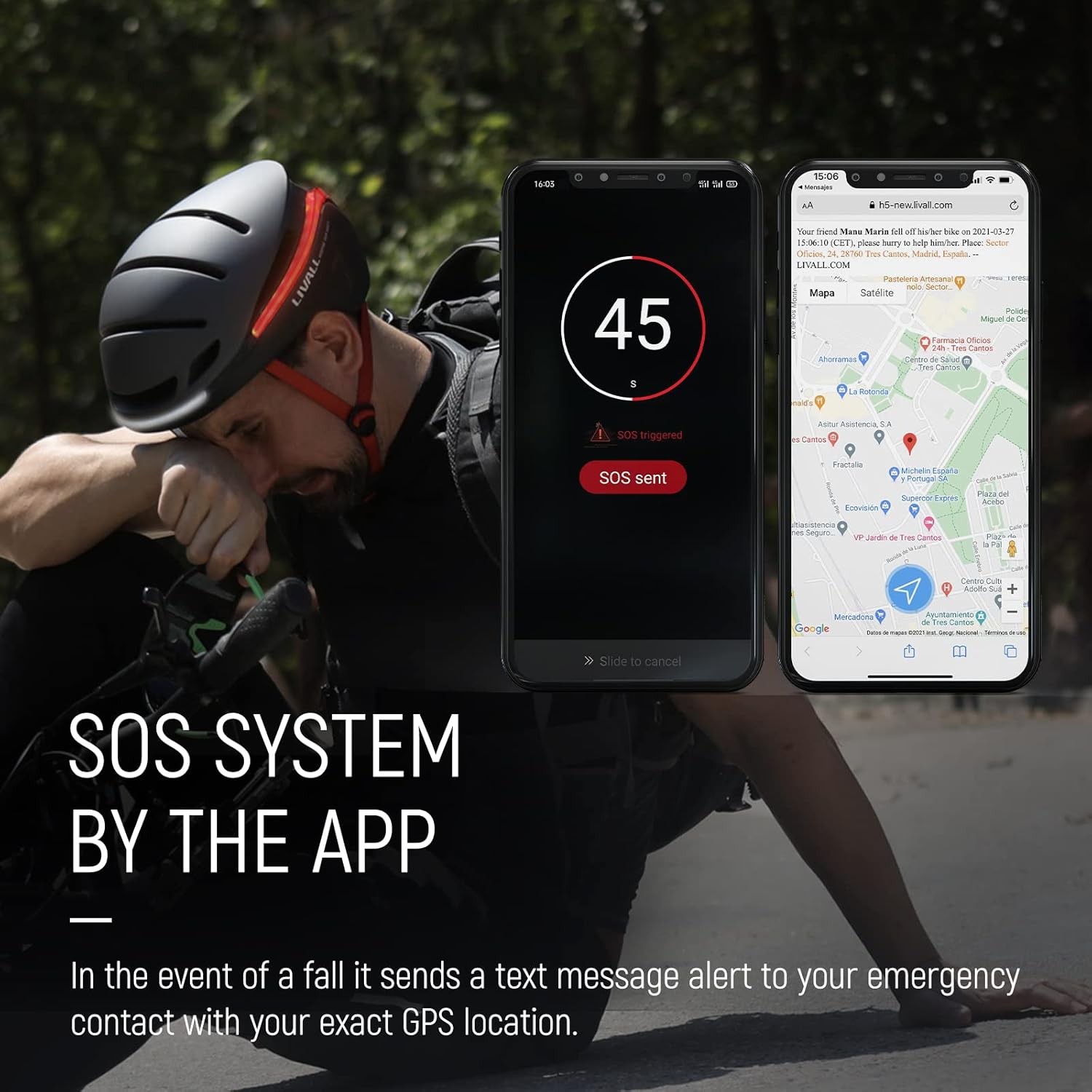 • SOS-Warnung und Freundliche App: Der LIVALL Riding Smart Bike Helm verfügt über eine patentierte Sturzerkennung und SOS-Technologie, die App sendet eine SMS-Benachrichtigung an Ihren Notfallkontakt mit Ihrer genauen GPS-Position, wenn der Fahrer